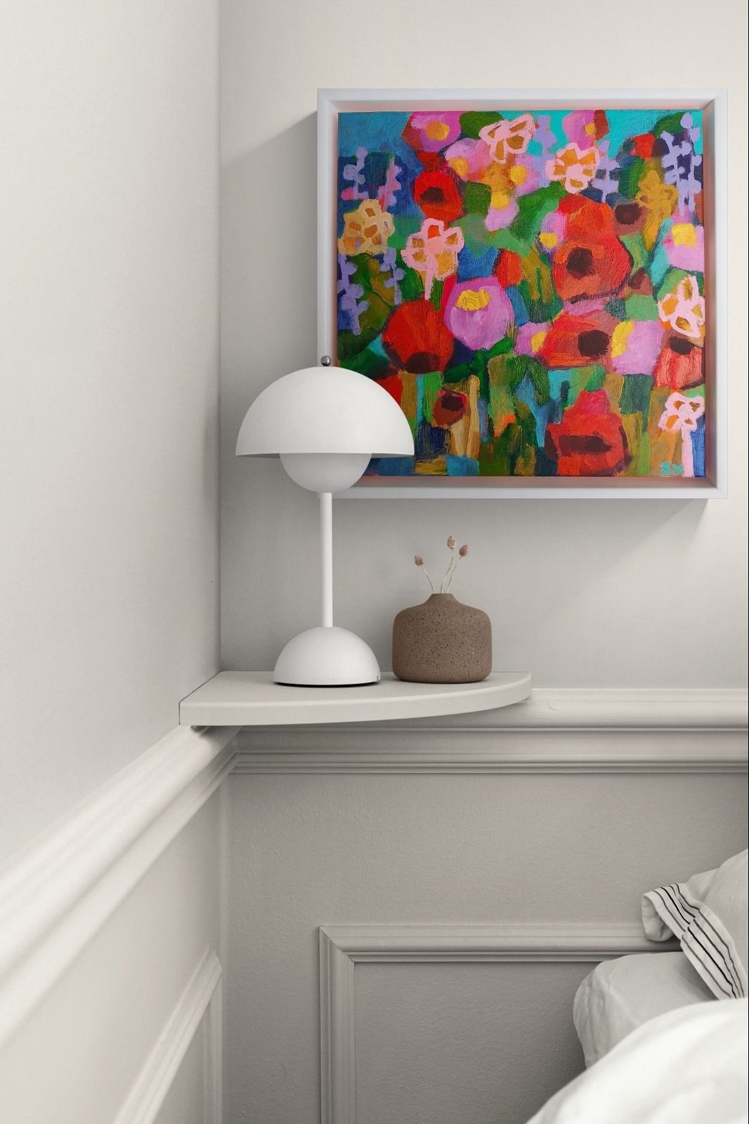 Energické barvy a pohyb — dárek, který rozzáří zimu i každý pokoj. V bílem rámu.