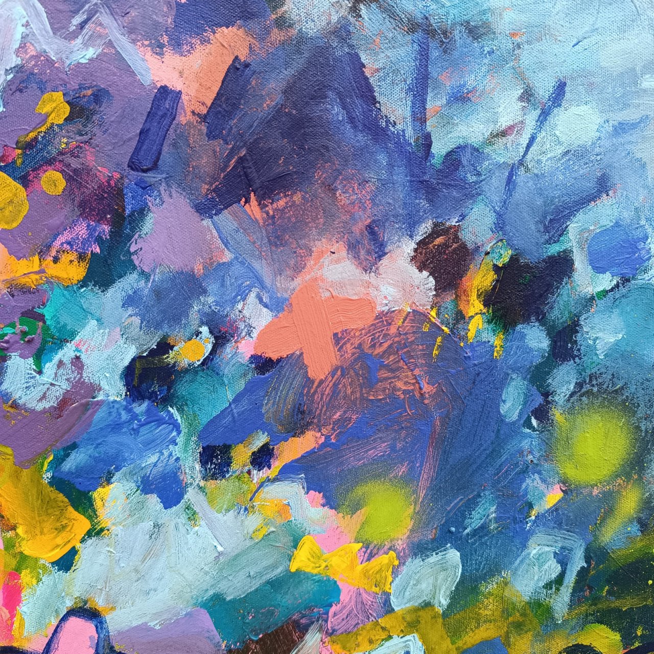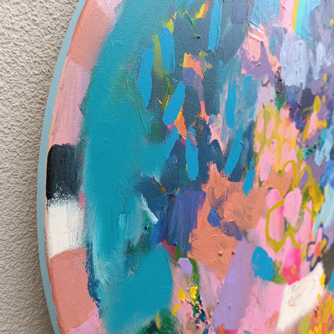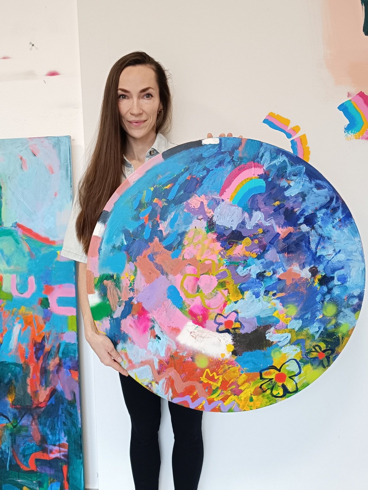 Abstraktní obraz na kulatém plátně o průměru 80 cm přináší kombinaci hluboké modře, vrstevnaté textury a jemných barevných přechodů. V obraze se objevuje duha, naznačené jarní mraky a rytmus padajícího deště, které společně vytvářejí dojem svěží jarní oblohy. Drobné abstraktní květy dodávají malbě lehkost a pocit probouzející se přírody. Díky výraznému vrstvení a kulatému formátu působí obraz jako živý, ale zároveň klidný prvek vhodný do moderního obývacího pokoje, vstupní haly, ložnice či kreativního pracovního prostoru.