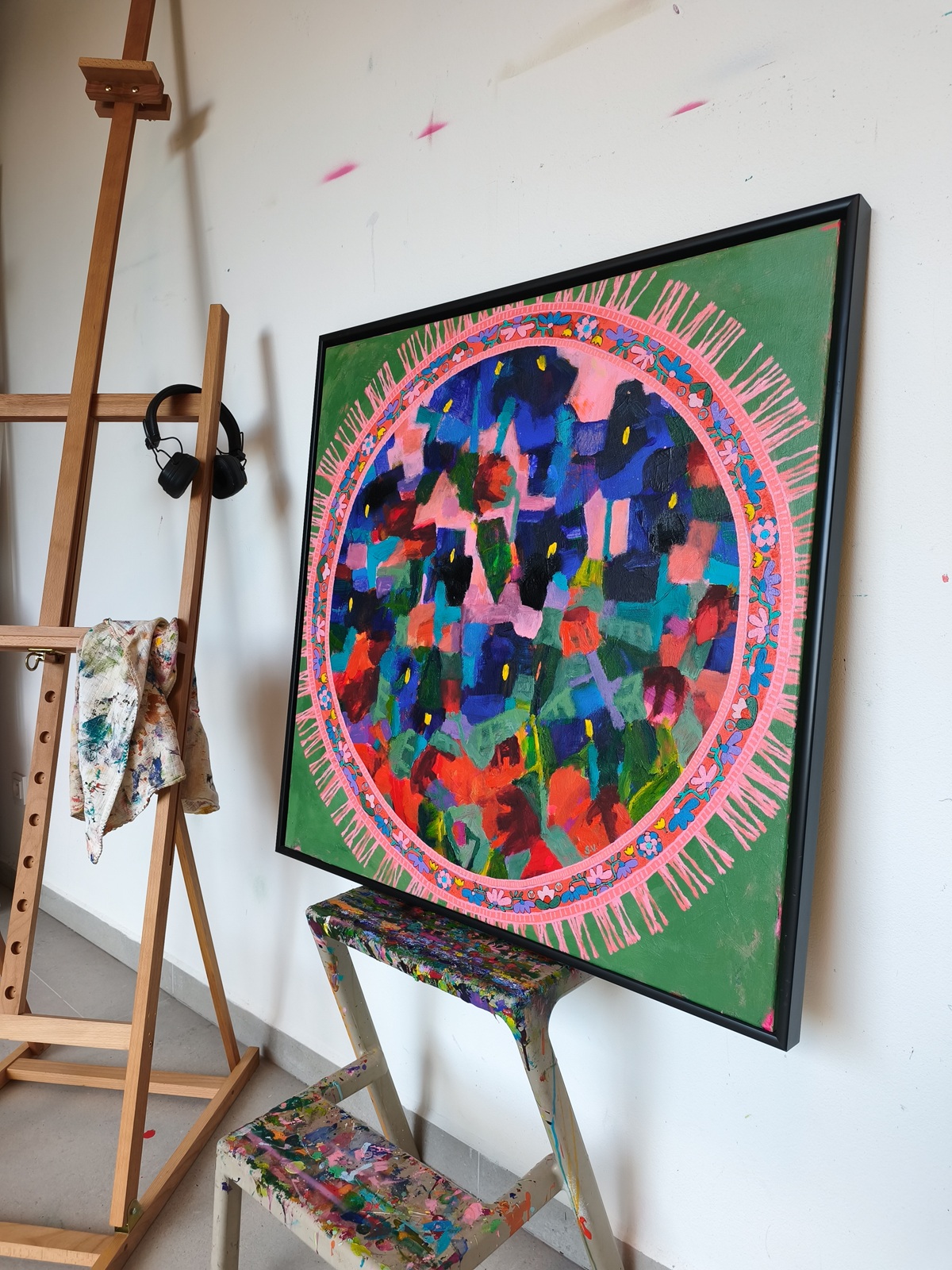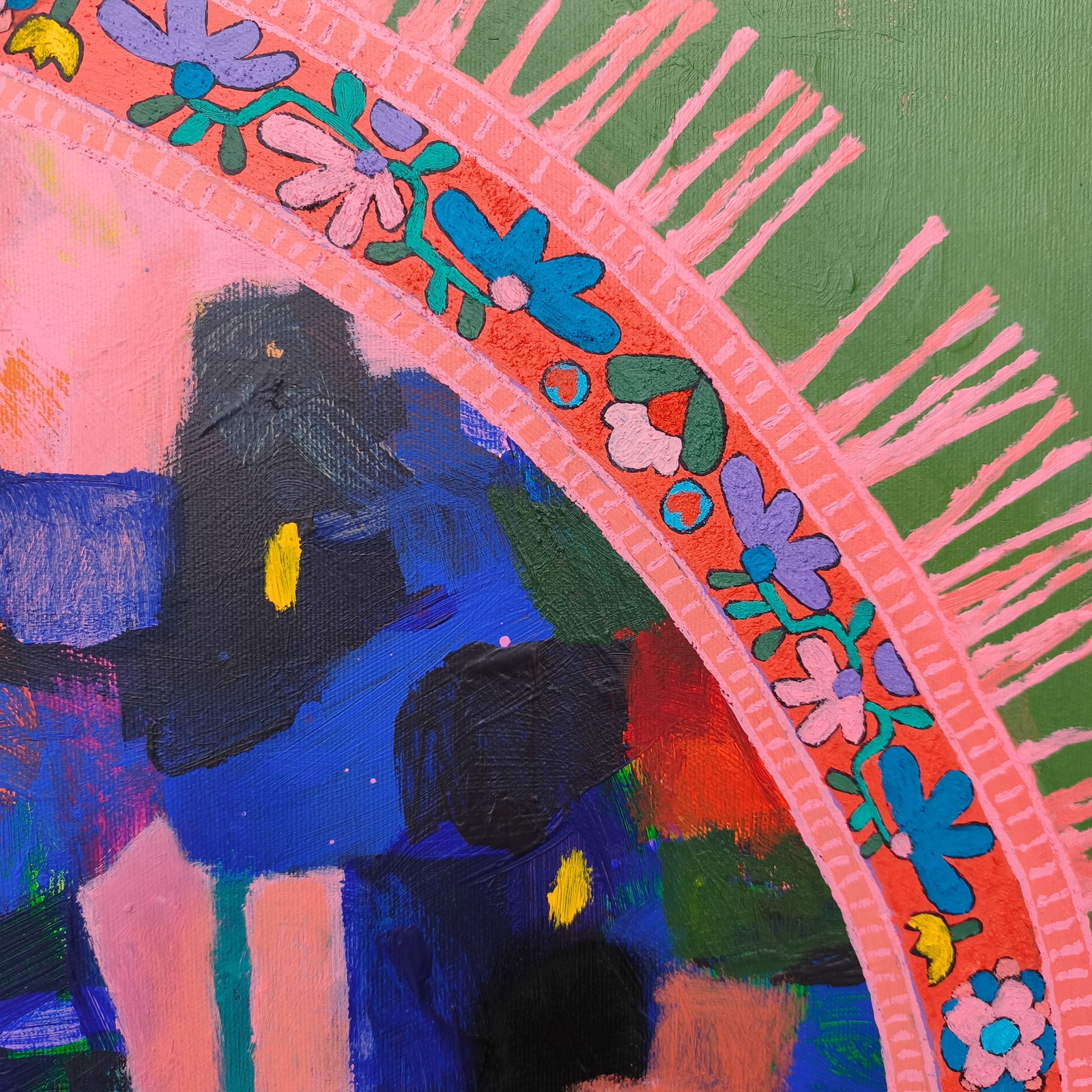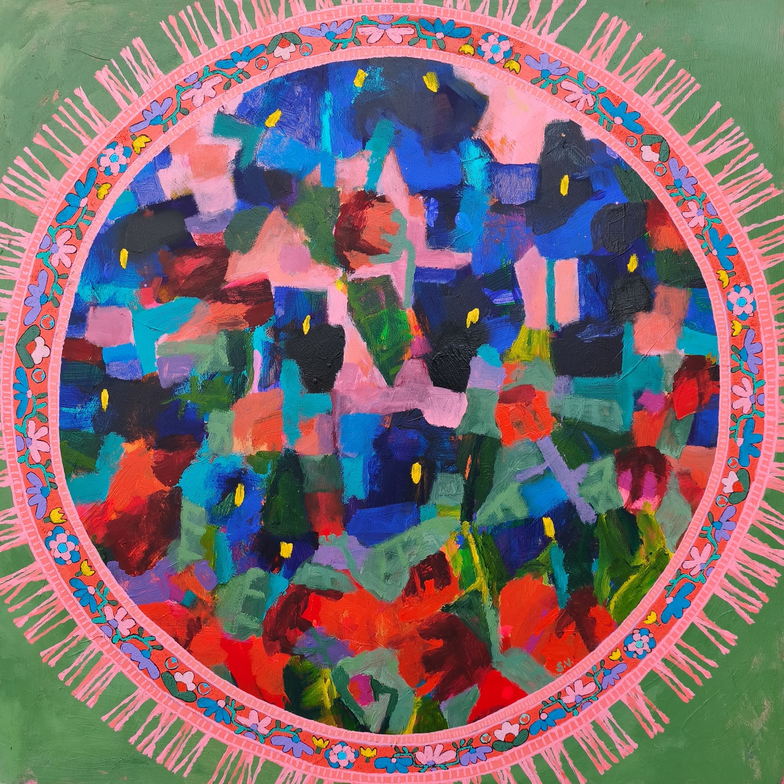 Středně velký obraz na plátně zobrazující kulatý koberec s třásněmi. Uvniř koberce jsou abstraktní květiny. Tmavě modré kosatce jsou motivem, který mě v poslením roce velice baví a postupně jej zpracovávám na více formátů. Najdete je například také na mých vlněných tapiseriích. Obraz Little Iris Rug (Malý kosatcový koberec) vás bude bavit, pokud máte rádi netradiční umění. Hodit se vám bude kamkoliv, motiv koberce působí hřejivě a útulně, takže klidně i do ložnice. Lem koberce má výraznou texturu.