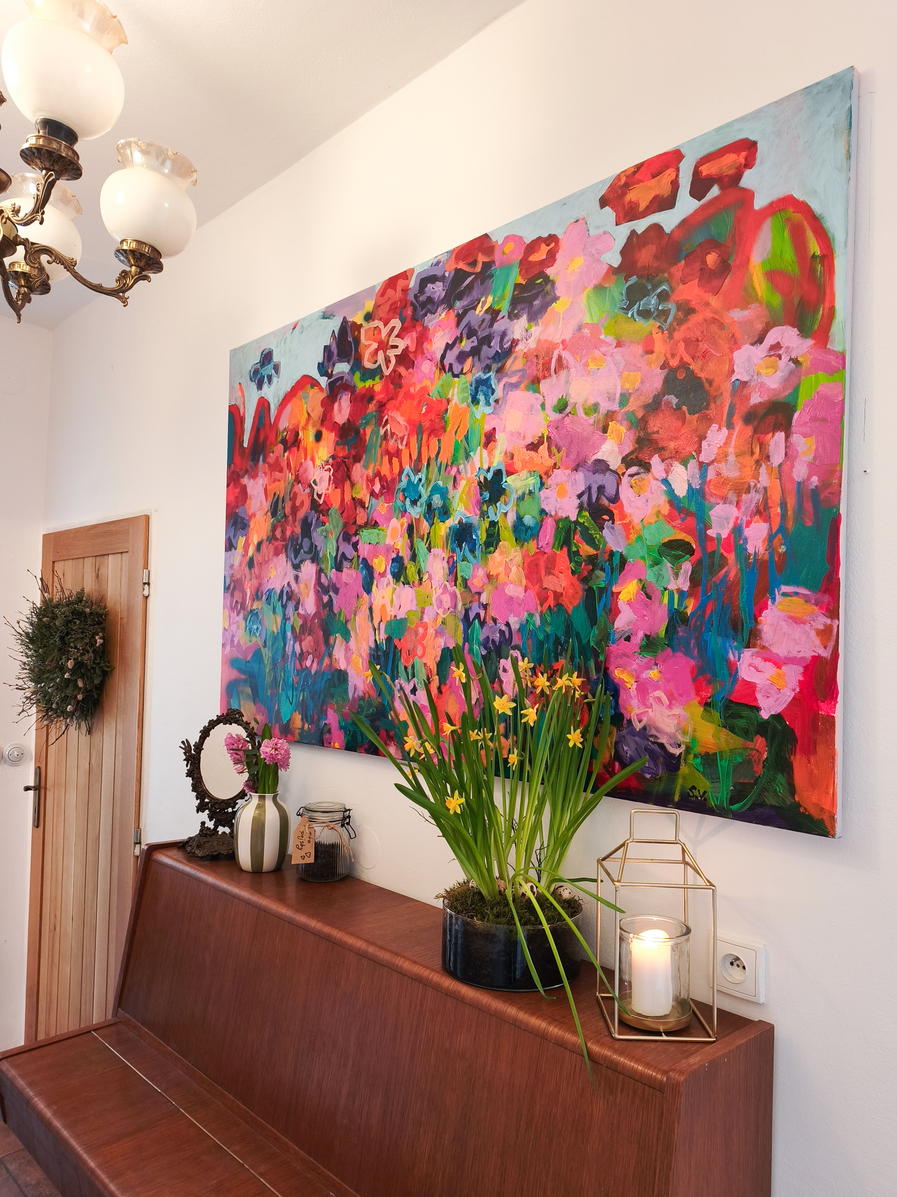 Velkoformátový obraz s květinovou abstrakcí v tónech červené, růžové a bordó. Petal Drama přináší energii, kontrast i hloubku do moderního interiéru – ideální nad pohovku, postel nebo na volnou stěnu. Dílo je malované akrylem na plátno, s výraznou strukturou a množstvím vrstev. Prostorově dominantní, a přitom jemně ženský akcent pro váš domov.