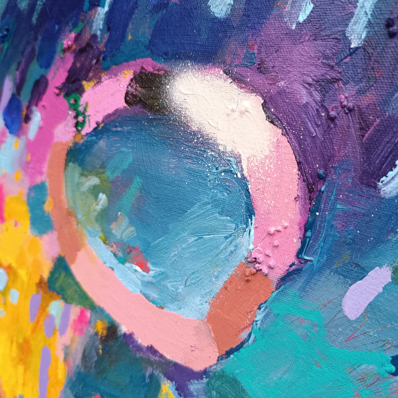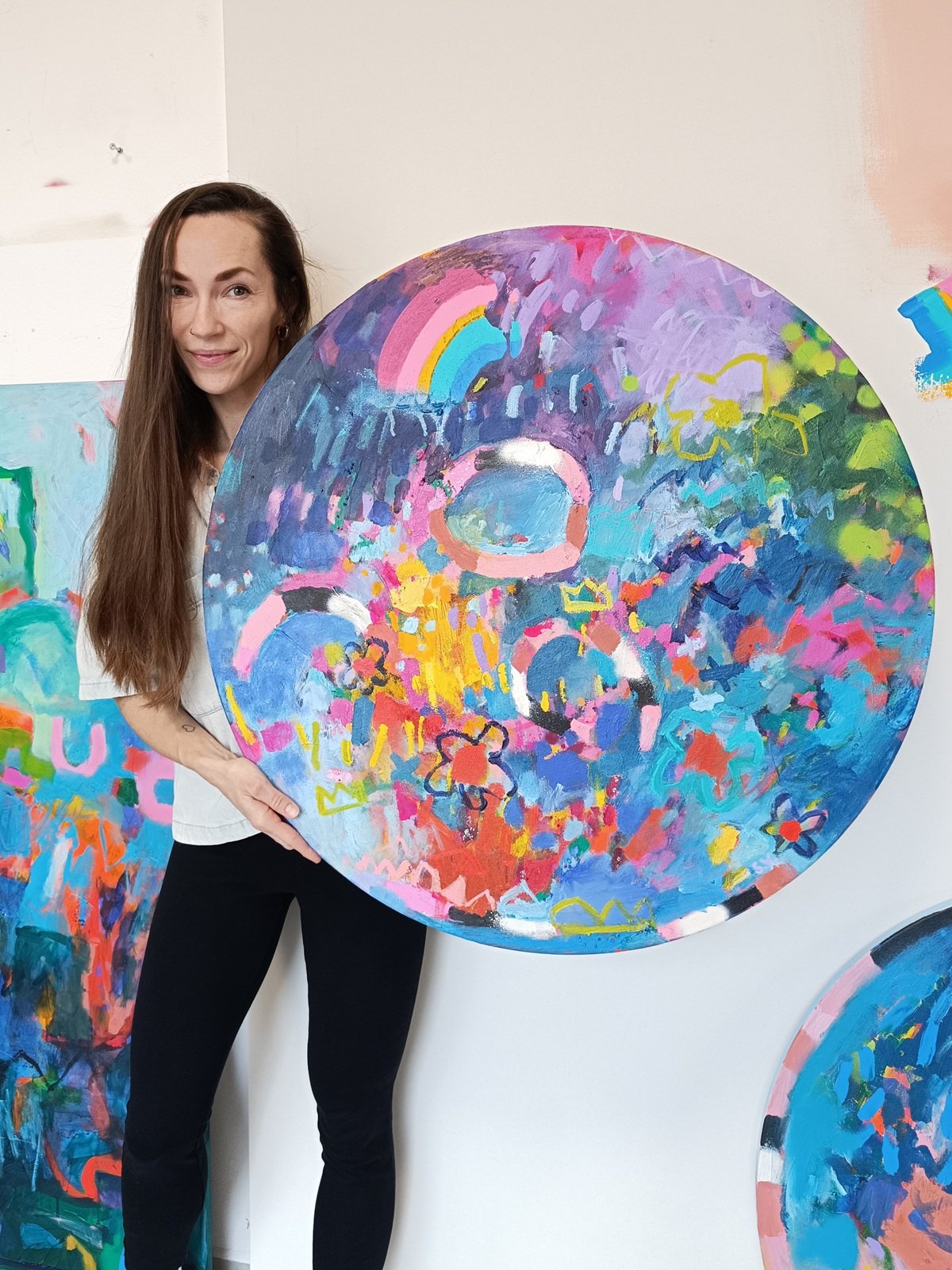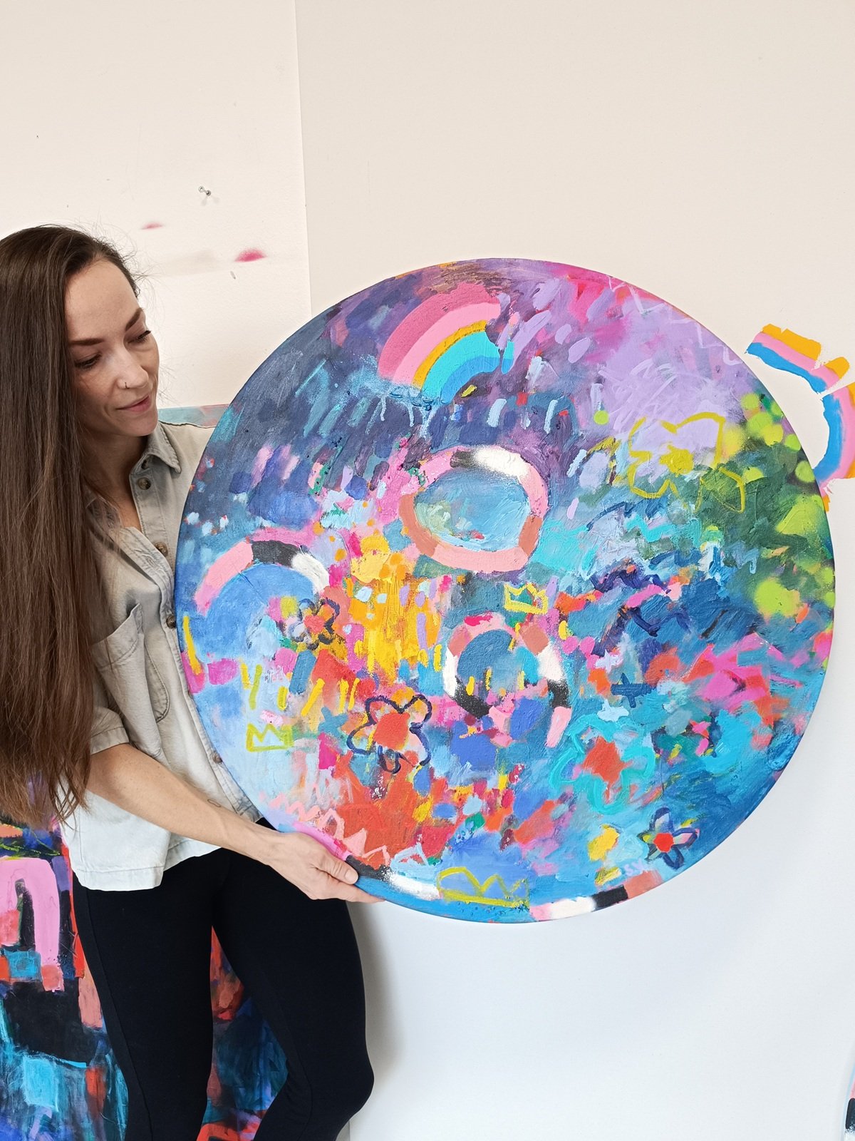 Tento kulatý abstraktní obraz o průměru 80 cm pracuje s výraznou texturou a mnoha vrstvami barev, které společně vytvářejí jemně snovou atmosféru. Modré a fialkové tóny doplňuje náznak duhy, jarních mraků a lehkého deště. V malbě se objevují i drobné abstraktní květinové tvary, které zjemňují celkový dojem. Díky kruhovému formátu působí obraz harmonicky a přirozeně se stává klidným vizuálním bodem v moderním interiéru. Hodí se do obývacího pokoje, ložnice, pracovny i do menších prostorů, kde potřebujete lehký, optimistický akcent.