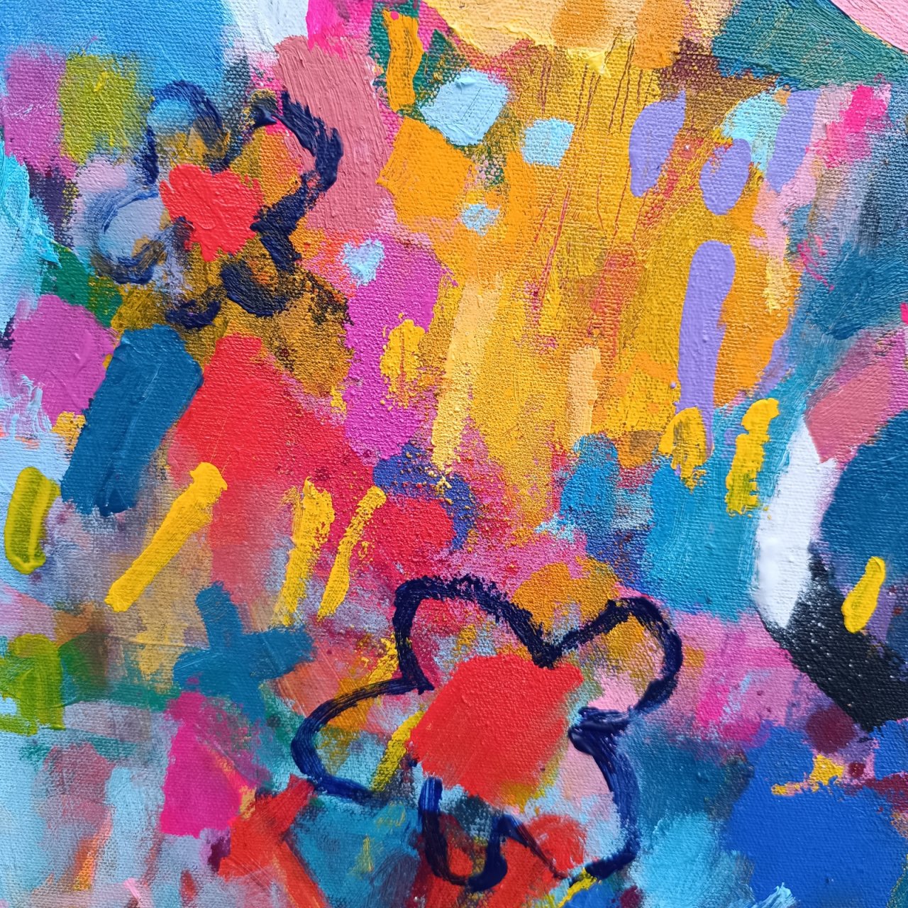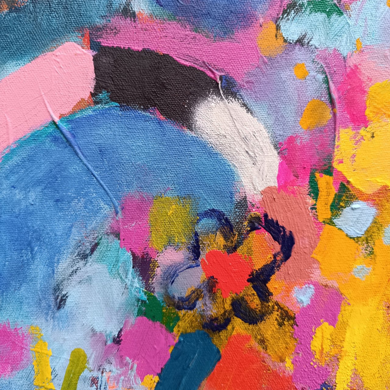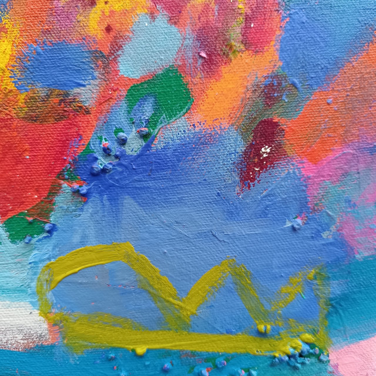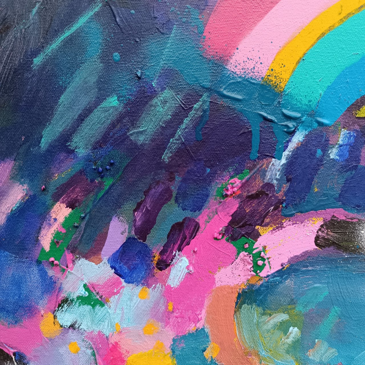 Tento kulatý abstraktní obraz o průměru 80 cm pracuje s výraznou texturou a mnoha vrstvami barev, které společně vytvářejí jemně snovou atmosféru. Modré a fialkové tóny doplňuje náznak duhy, jarních mraků a lehkého deště. V malbě se objevují i drobné abstraktní květinové tvary, které zjemňují celkový dojem. Díky kruhovému formátu působí obraz harmonicky a přirozeně se stává klidným vizuálním bodem v moderním interiéru. Hodí se do obývacího pokoje, ložnice, pracovny i do menších prostorů, kde potřebujete lehký, optimistický akcent.