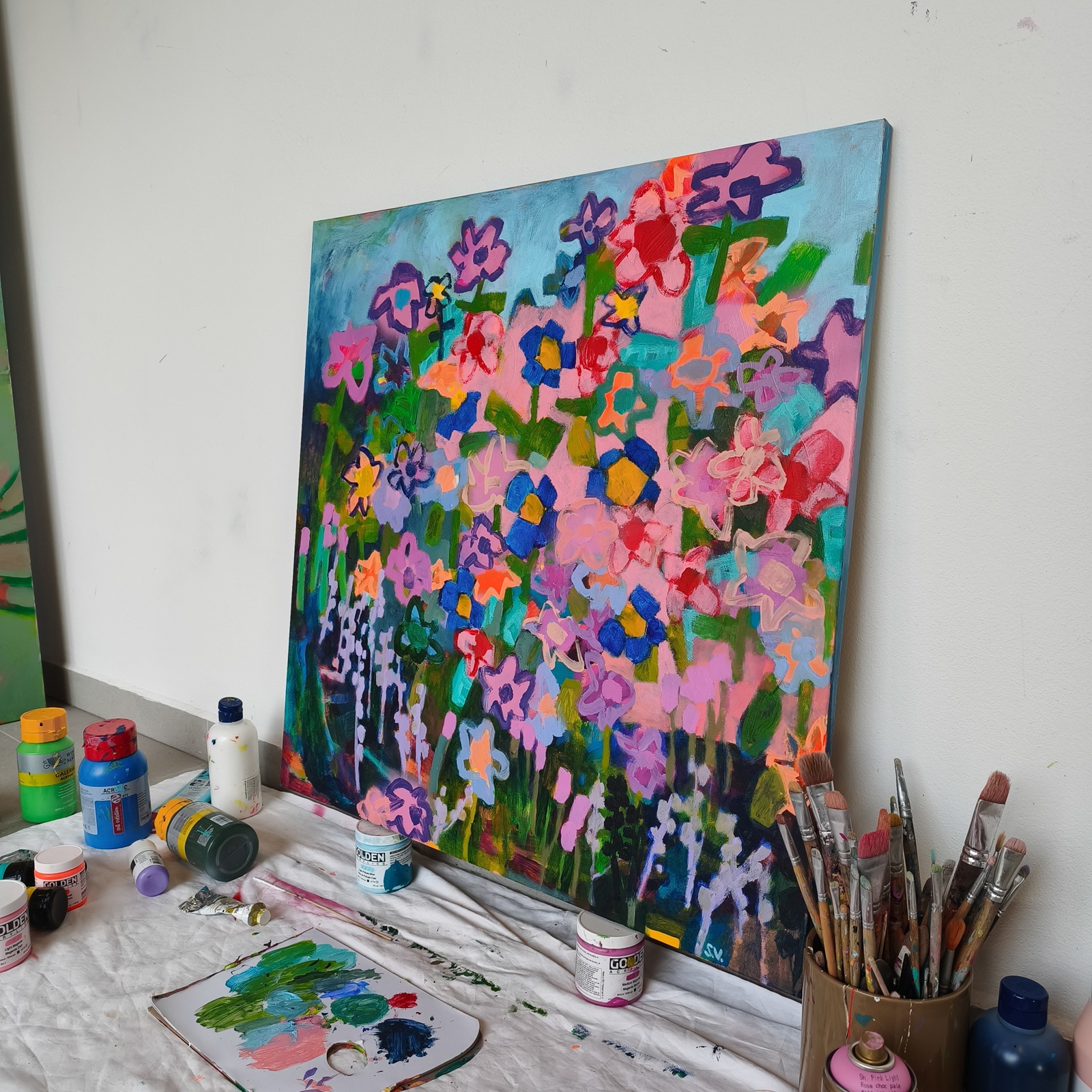 „Stardust Blossoms“ je expresivní abstraktní obraz ve formátu 150 × 110 cm. Jemné kvítky a barevné plochy navozují pocit snové krajiny, na kterou se snáší hvězdný prach. Dílo vdechuje prostoru klid, zároveň ale elektrizující jiskru fantazie.