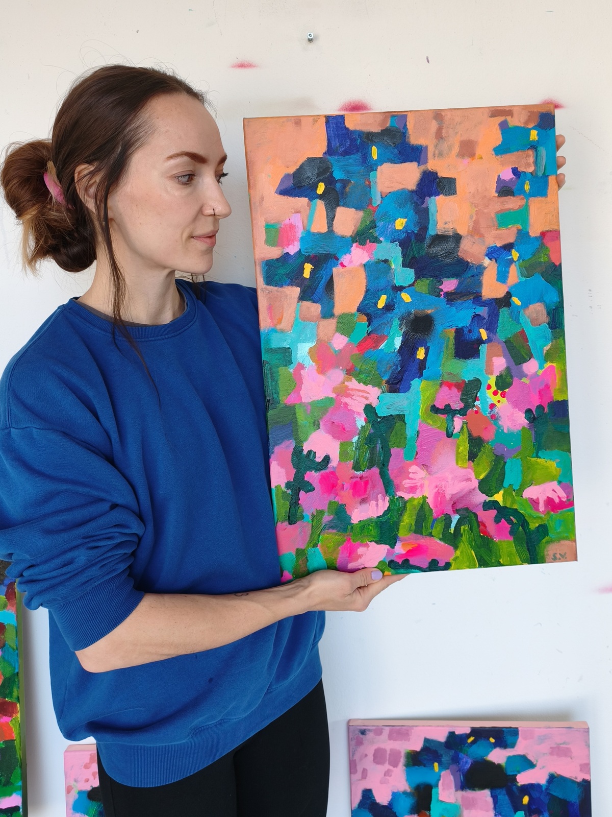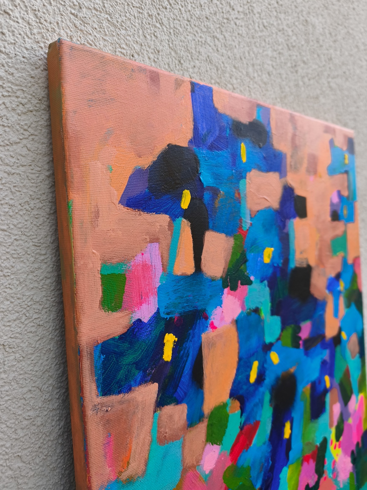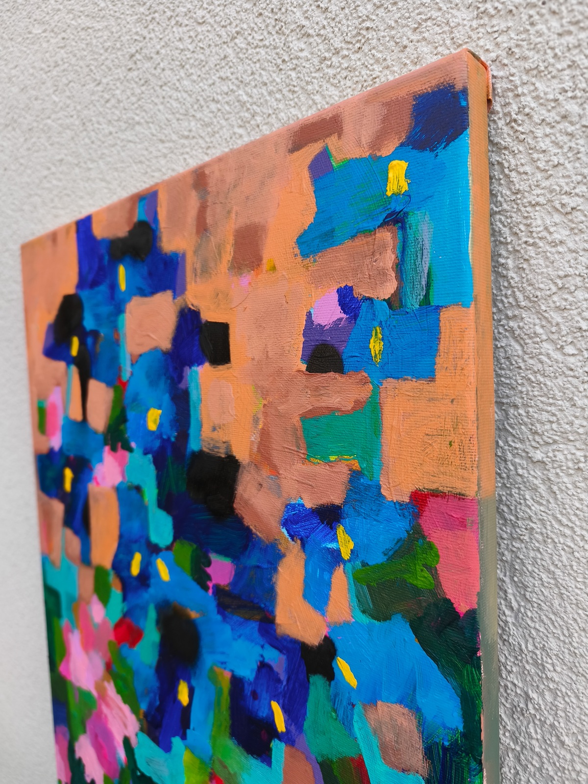Abstraktní květinový obraz s výraznou strukturou a volnou malbou. Kompozice kombinuje organické tvary s jemně geometrickým rytmem, který místy působí až minimalisticky.