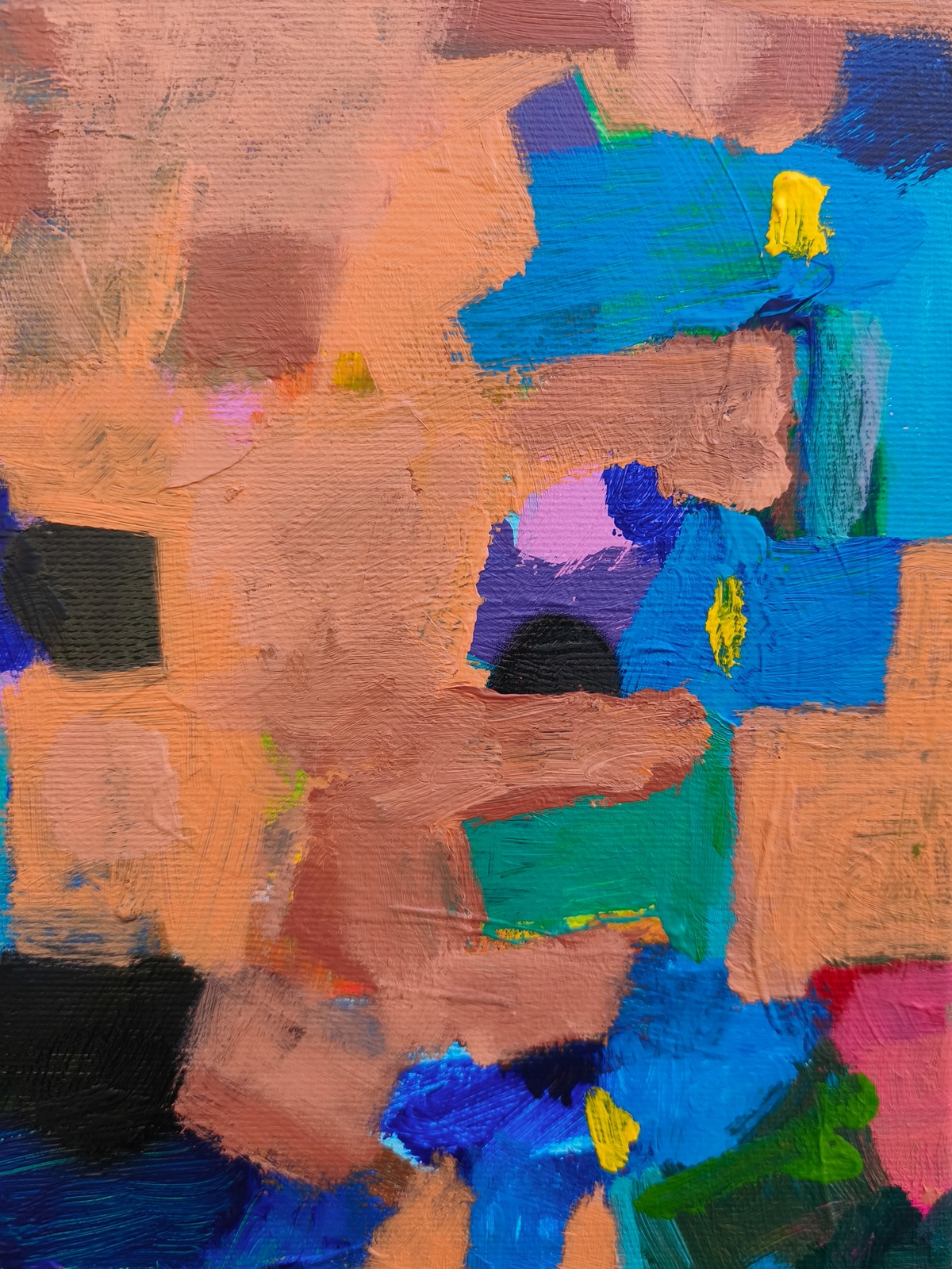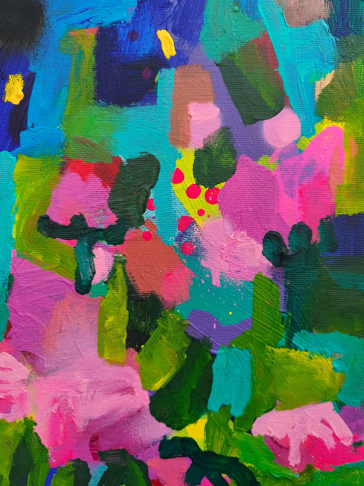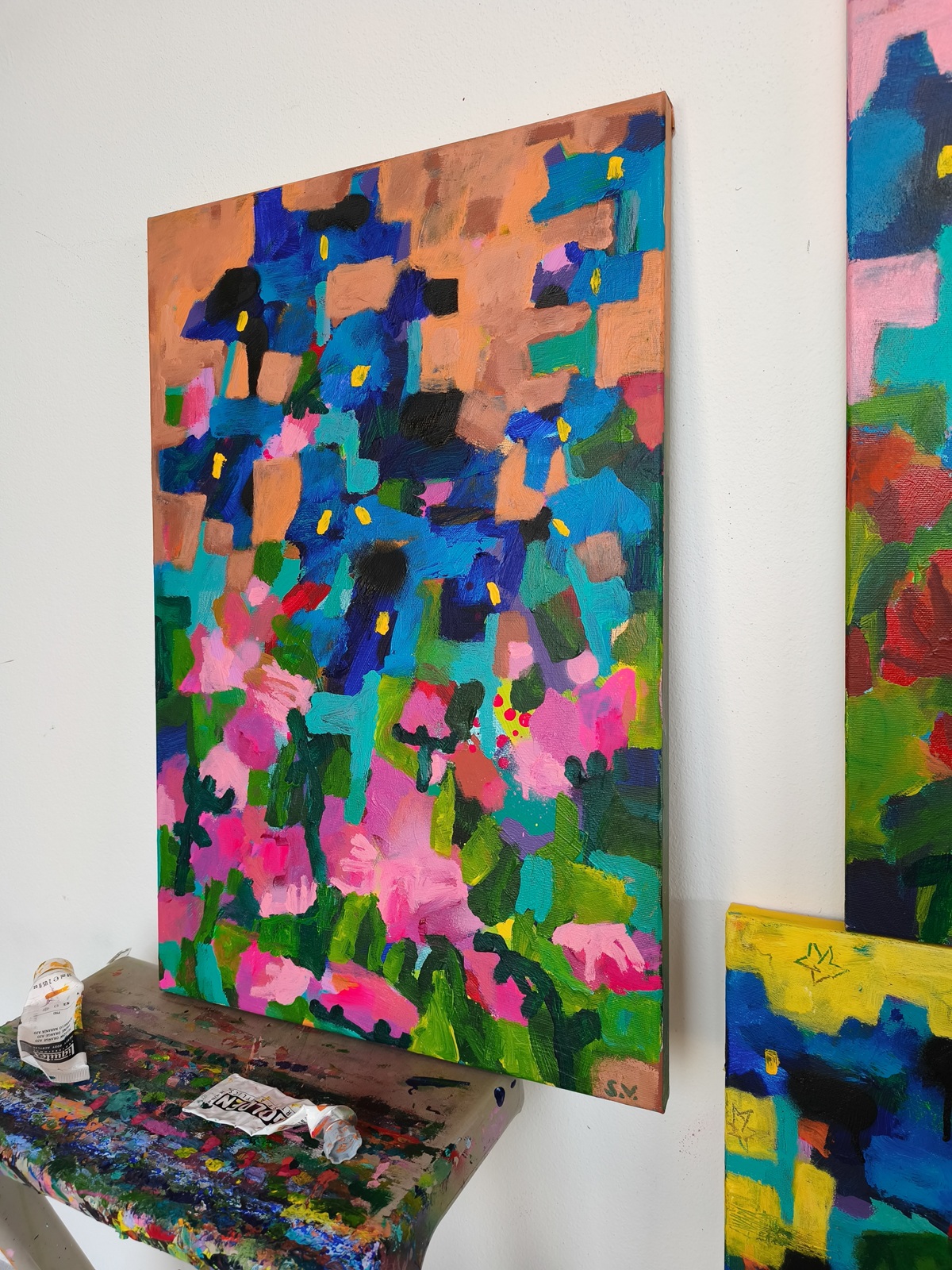 Abstraktní květinový obraz s výraznou strukturou a volnou malbou. Kompozice kombinuje organické tvary s jemně geometrickým rytmem, který místy působí až minimalisticky.