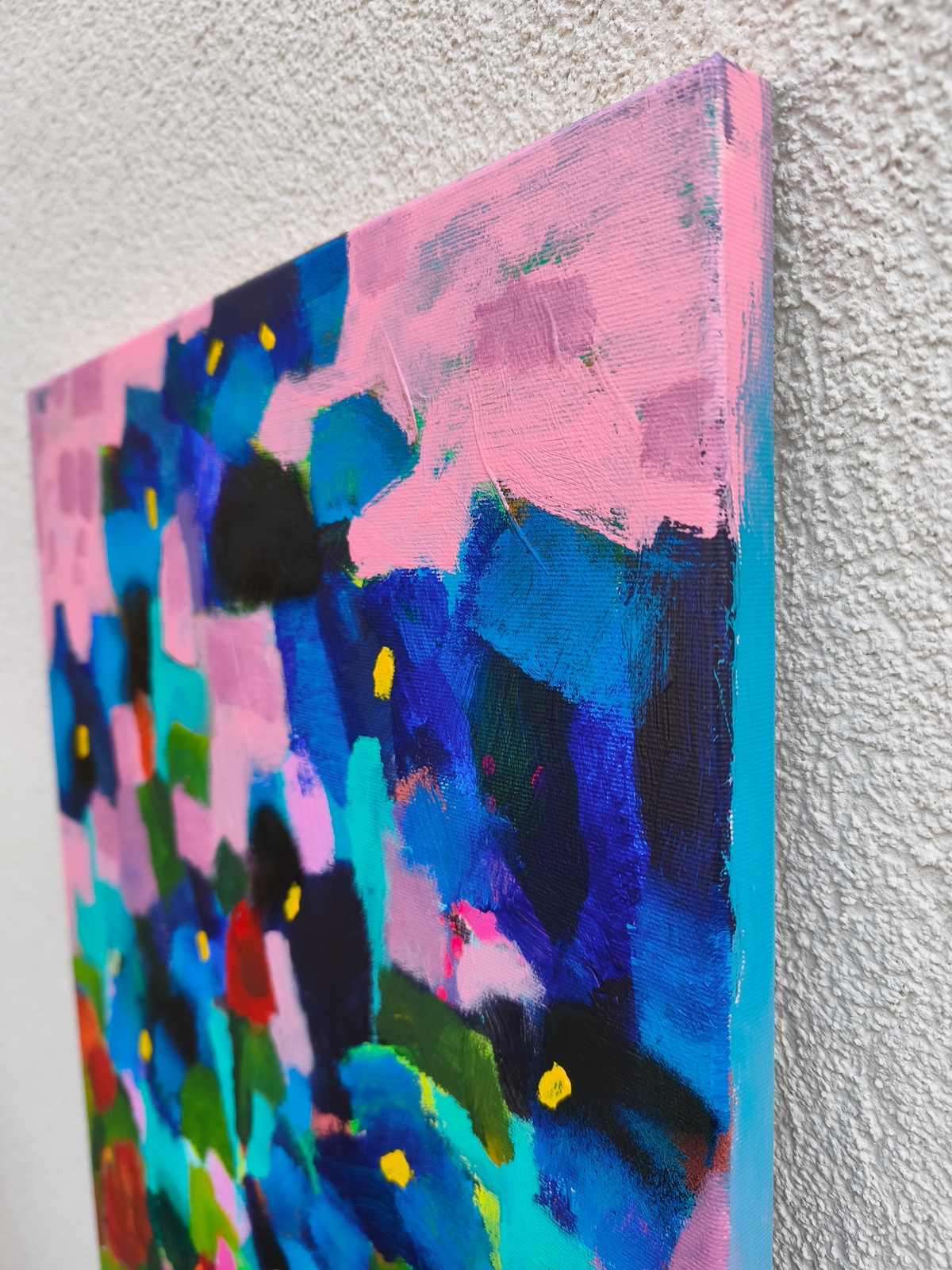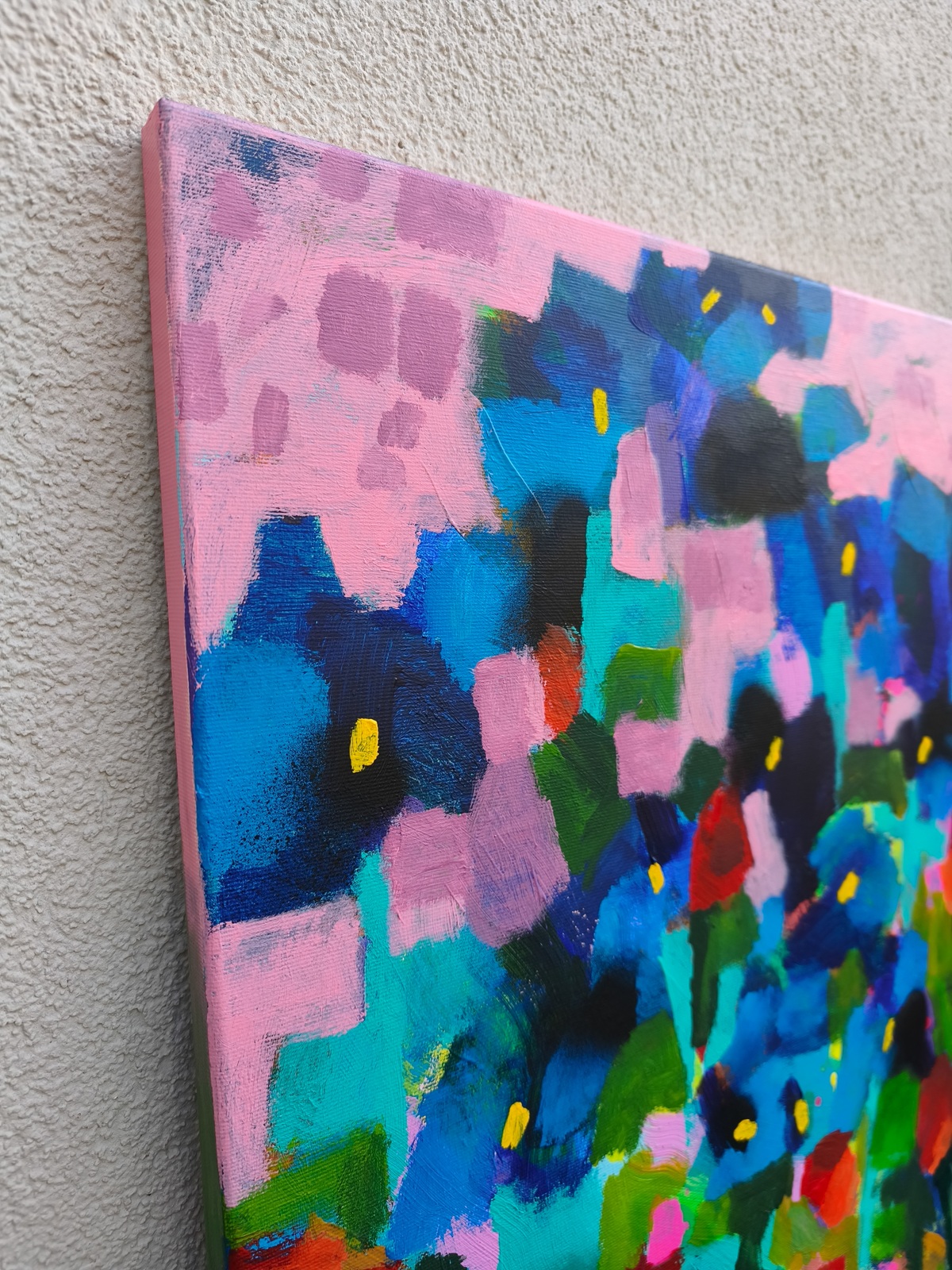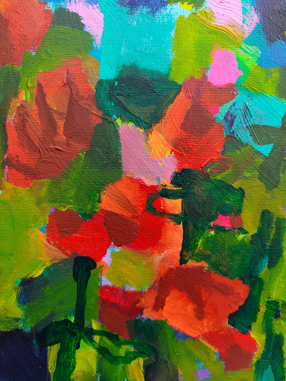 Menší formát, který ale nezanikne. Abstraktní květinová kompozice s výraznou texturou a volnou malbou přináší do prostoru barvu i strukturu.