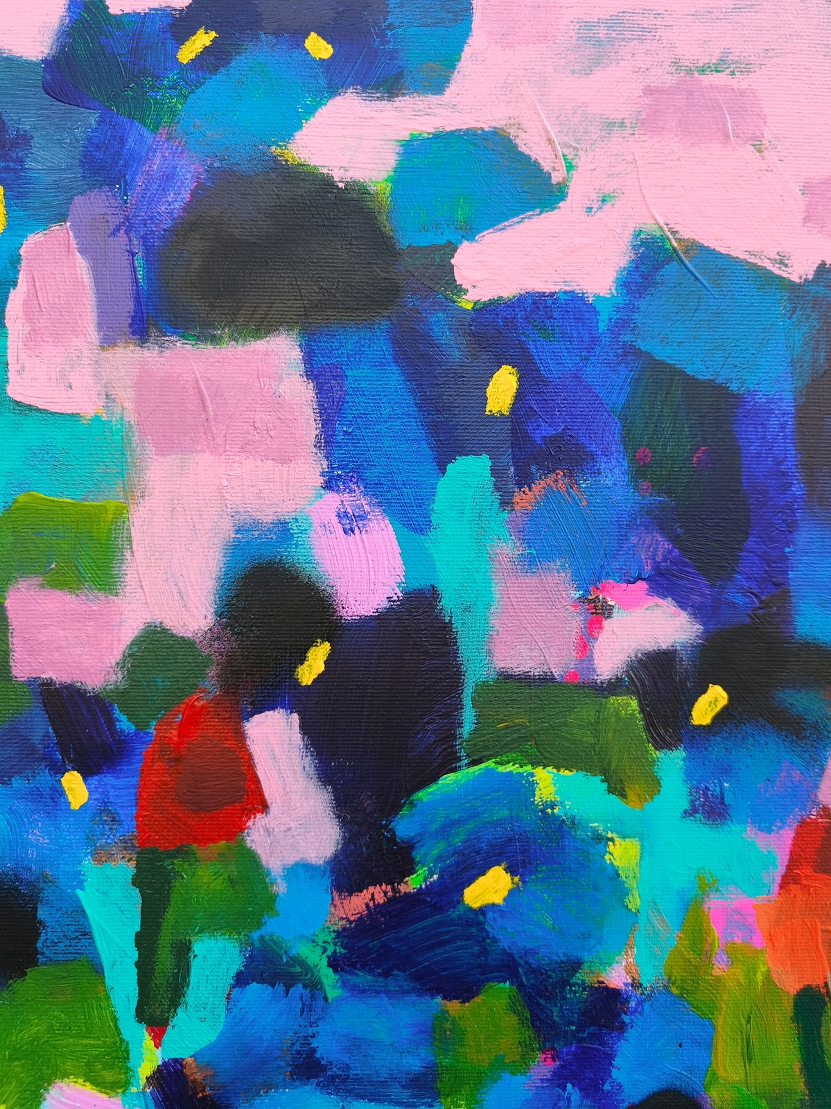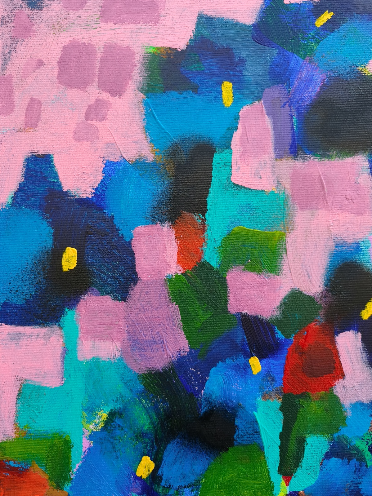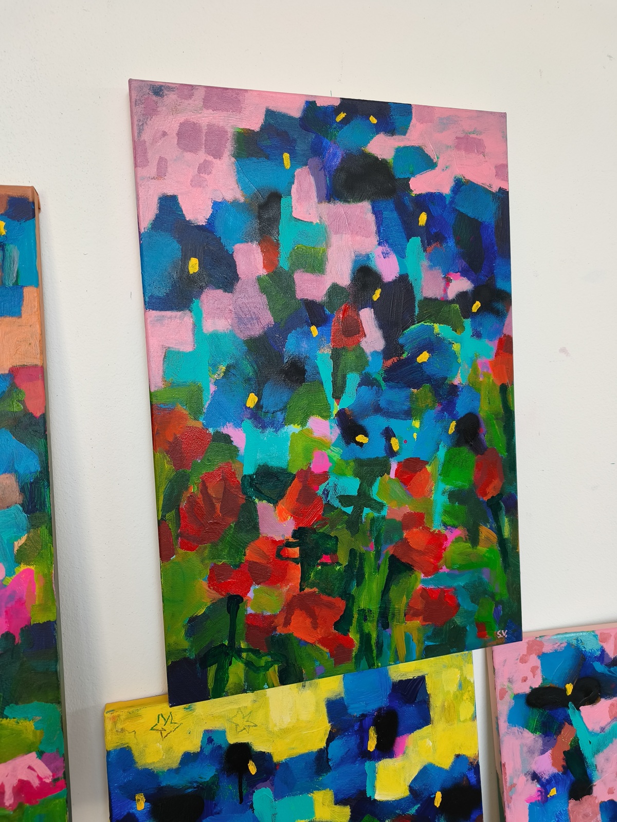Menší formát, který ale nezanikne. Abstraktní květinová kompozice s výraznou texturou a volnou malbou přináší do prostoru barvu i strukturu.
