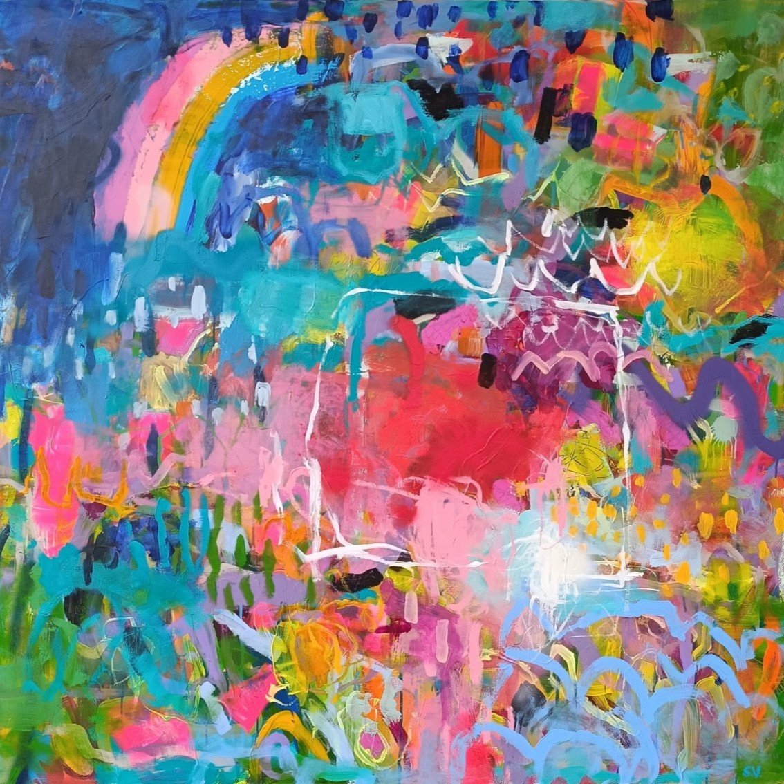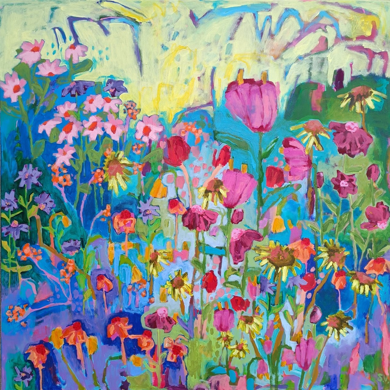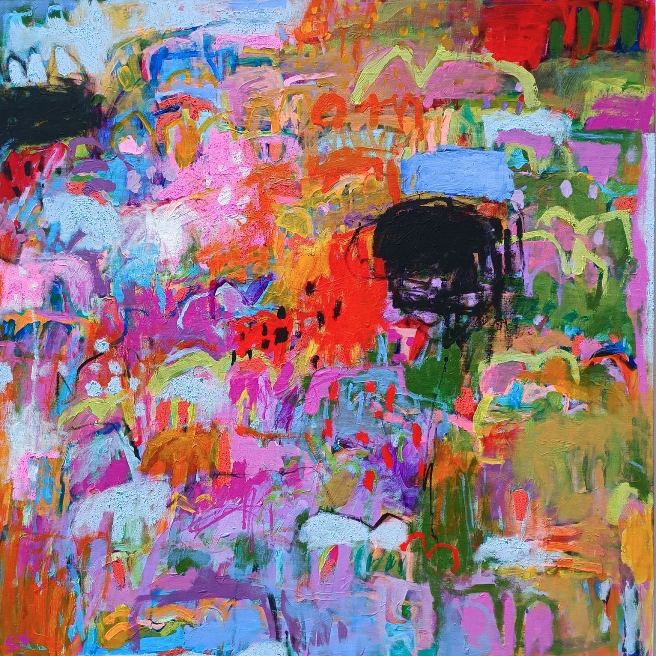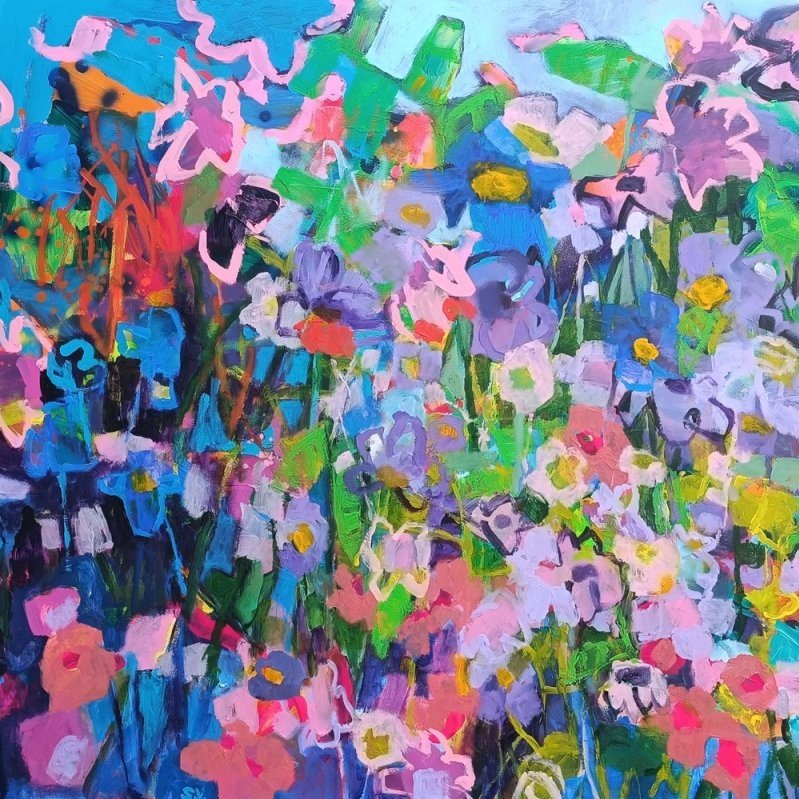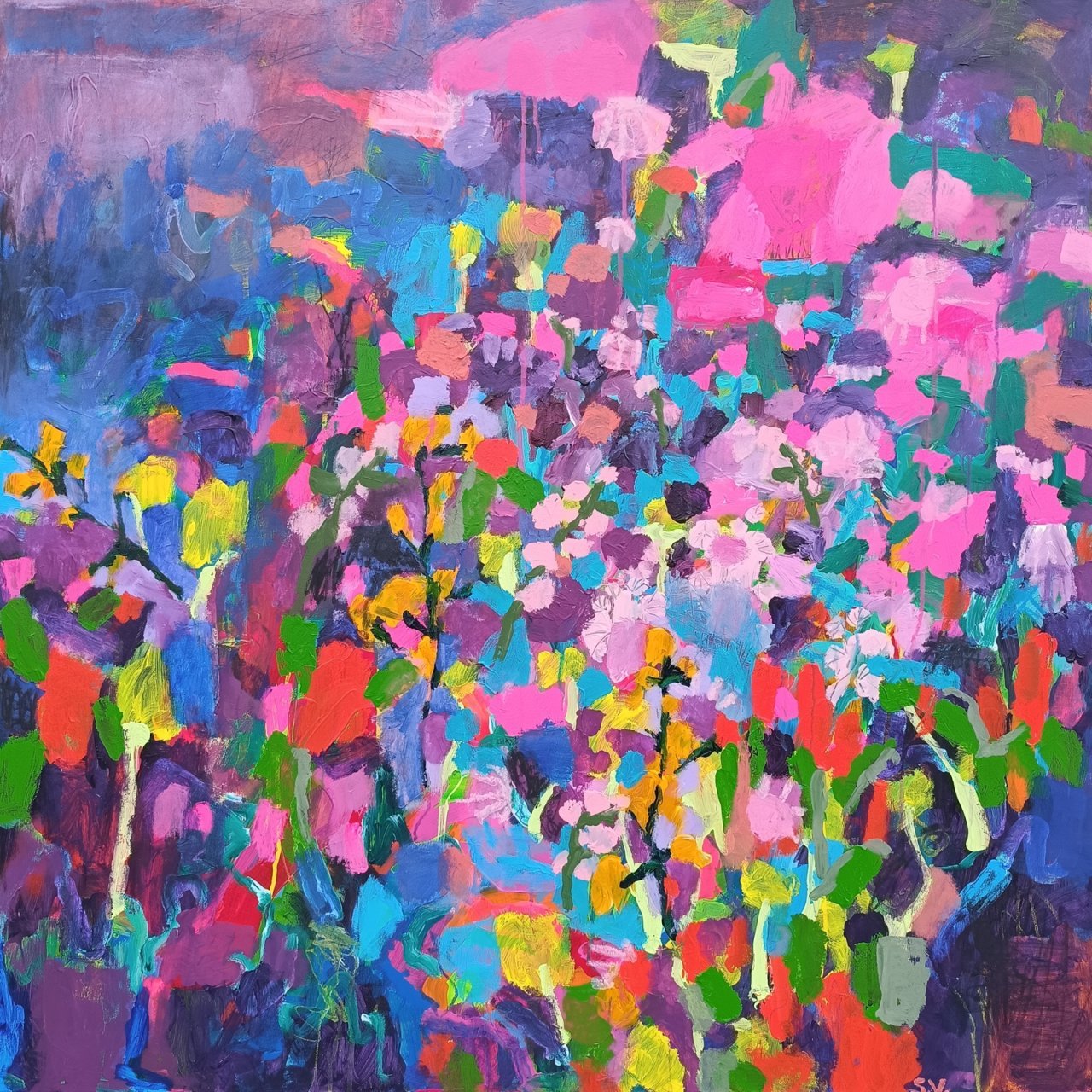 Vedle květinových luk jsem se občas vracela také k čisté abstrakci. Tyto obrazy byly v té době opravdu velmi volné a nepřipomínaly krajinu ani konkrétní motivy – šlo spíše o práci s barvou, rytmem a kompozicí. Příkladem je obraz Another Story, který má 100 x 100 cm.
