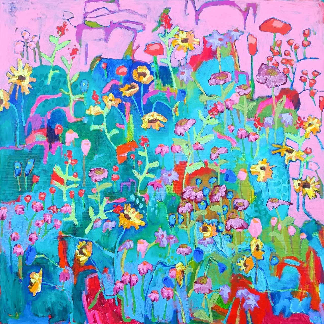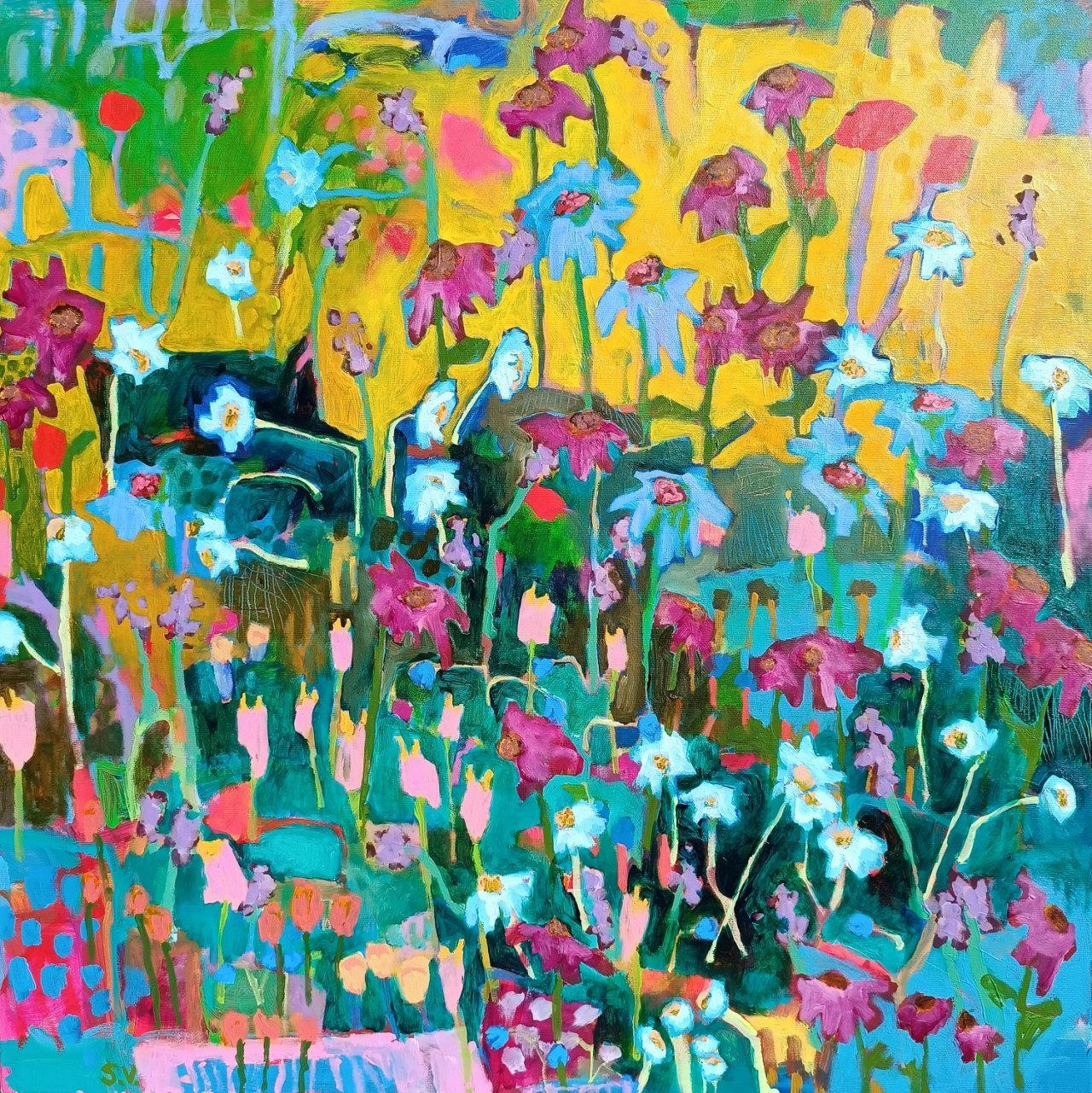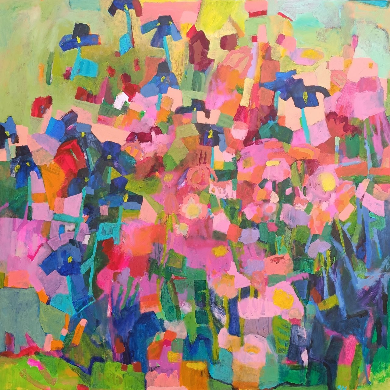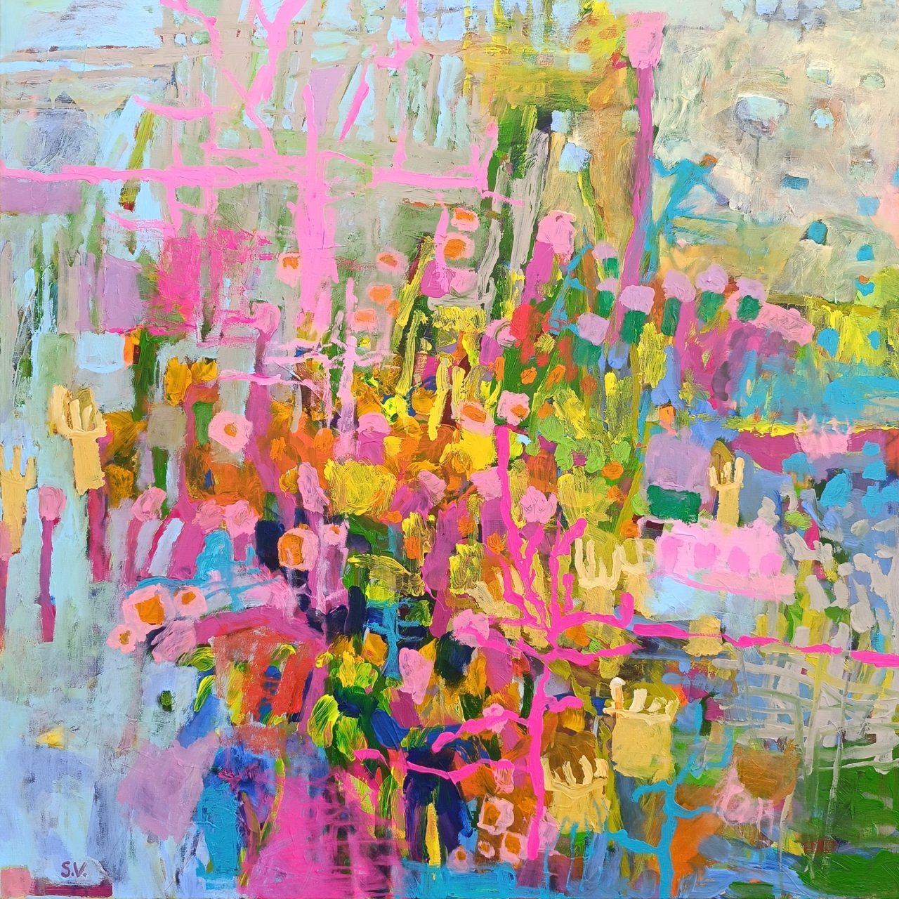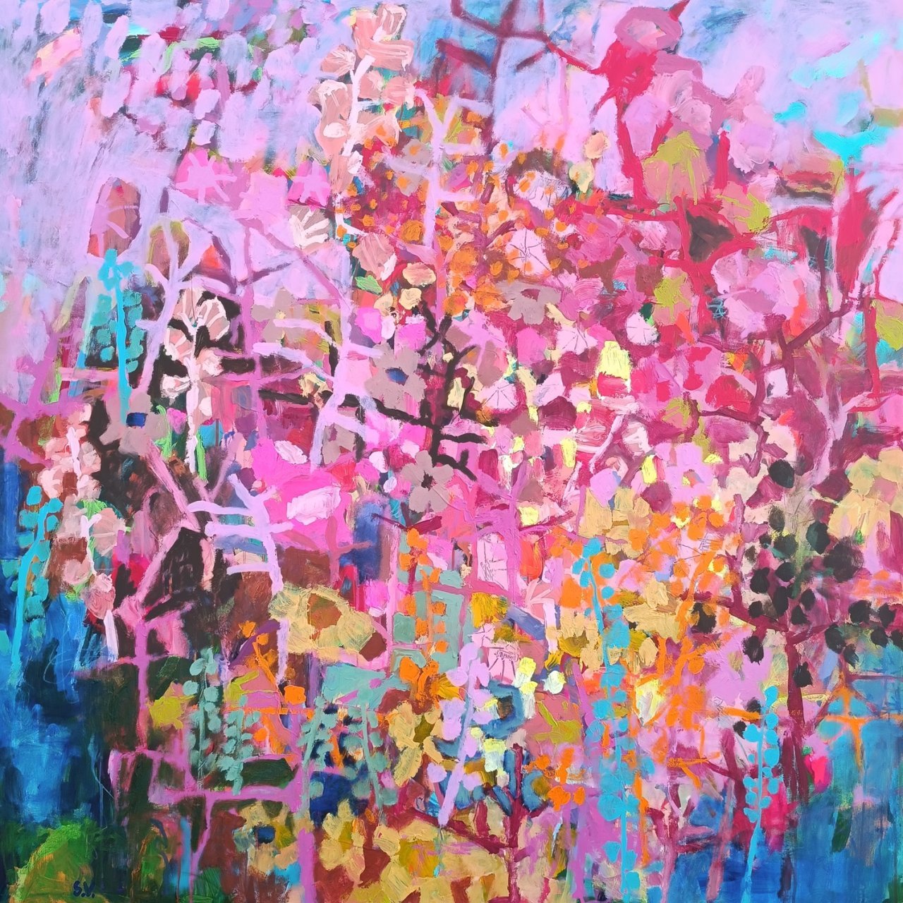 Vedle květinových luk jsem se občas vracela také k čisté abstrakci. Tyto obrazy byly v té době opravdu velmi volné a nepřipomínaly krajinu ani konkrétní motivy – šlo spíše o práci s barvou, rytmem a kompozicí. Příkladem je obraz Another Story, který má 100 x 100 cm.