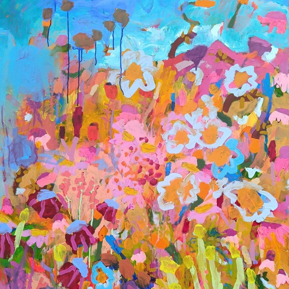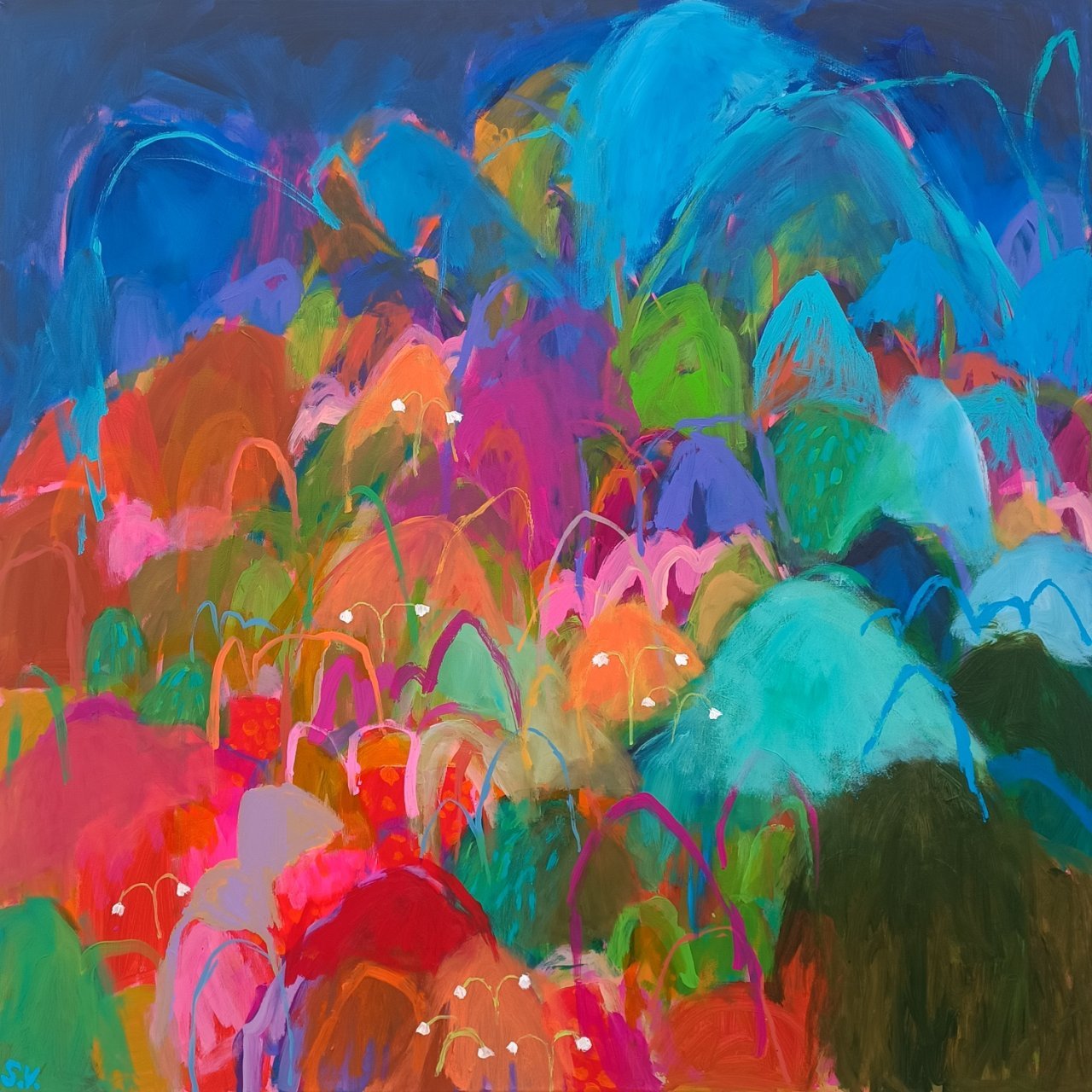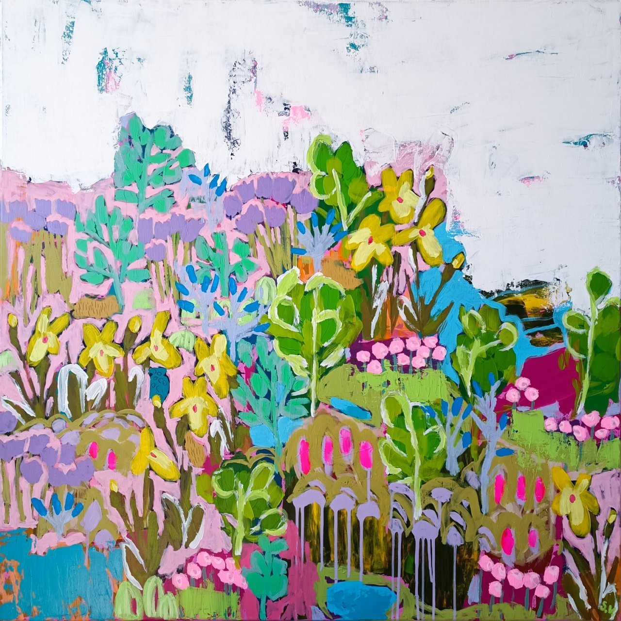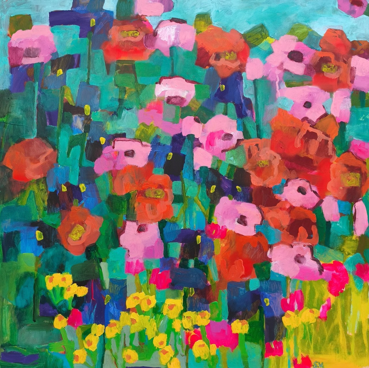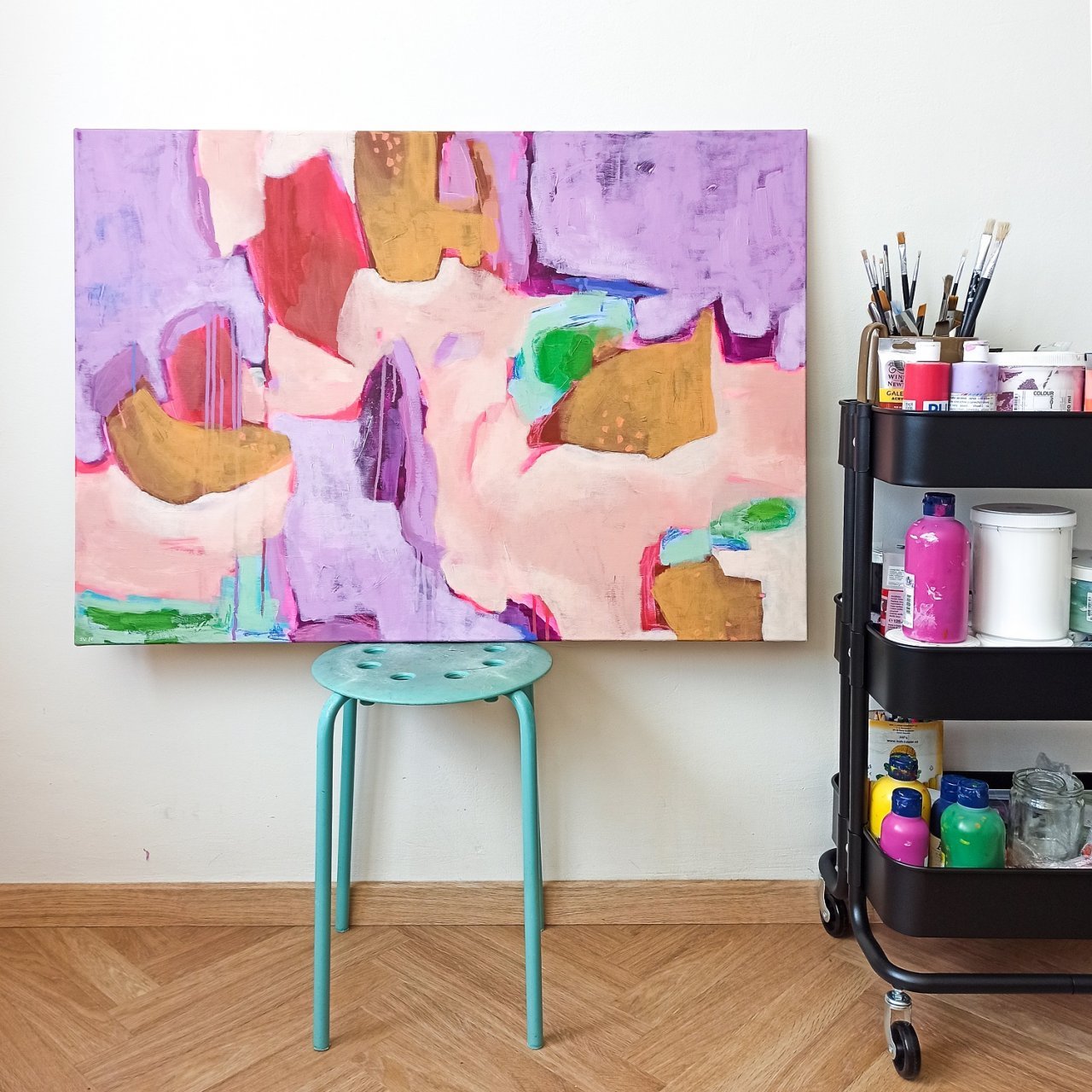 Vedle květinových luk jsem se občas vracela také k čisté abstrakci. Tyto obrazy byly v té době opravdu velmi volné a nepřipomínaly krajinu ani konkrétní motivy – šlo spíše o práci s barvou, rytmem a kompozicí. Příkladem je obraz Another Story, který má 100 x 100 cm.