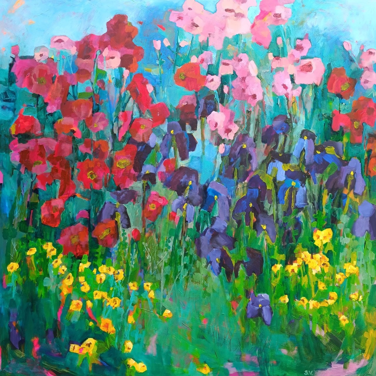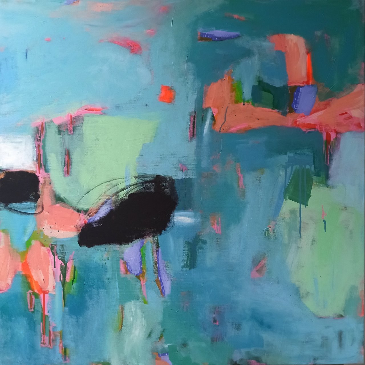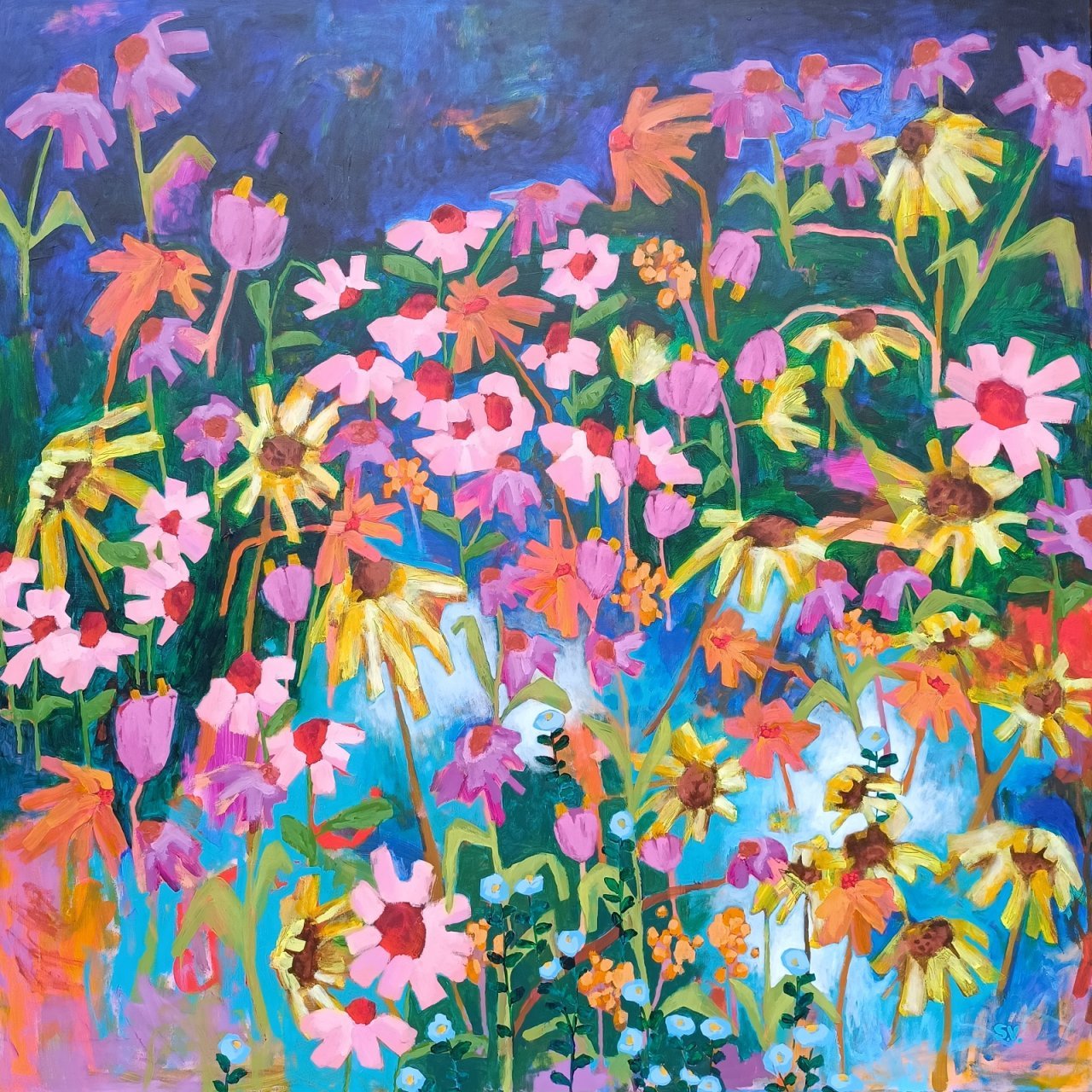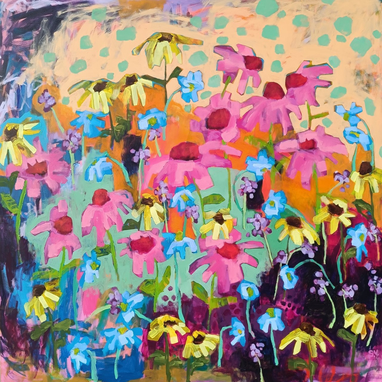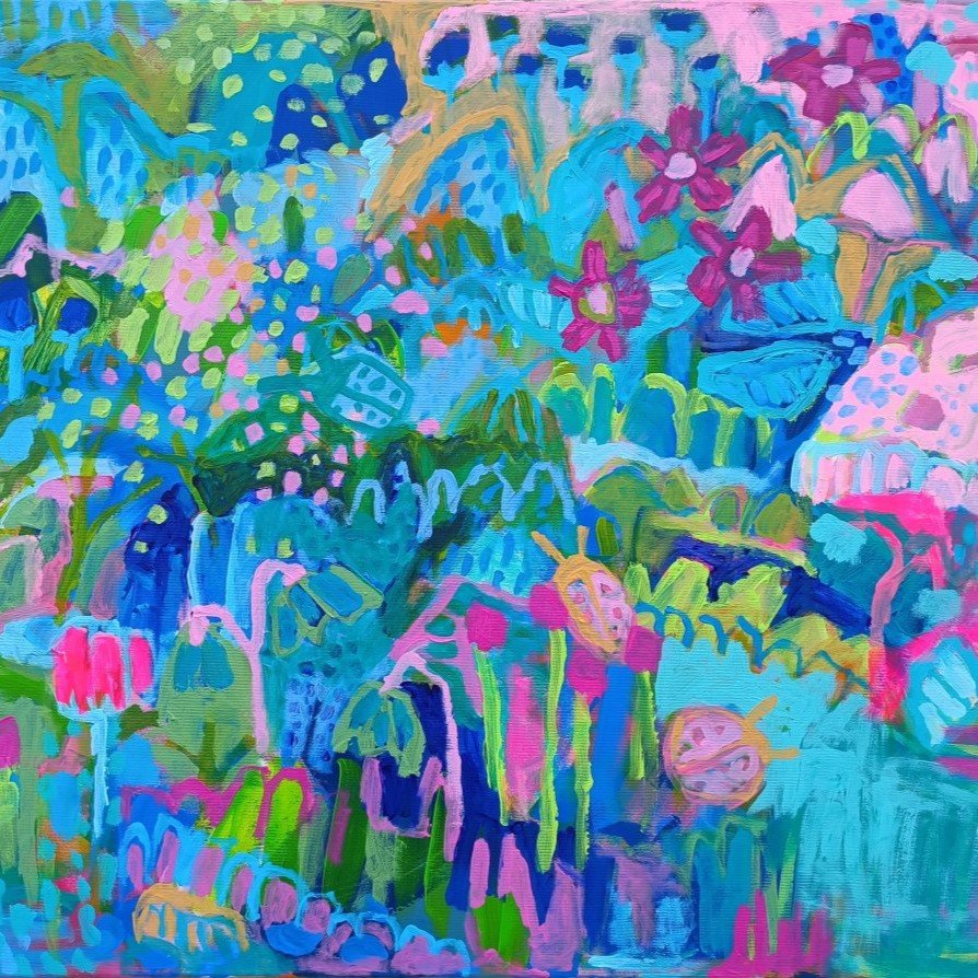 Vedle květinových luk jsem se občas vracela také k čisté abstrakci. Tyto obrazy byly v té době opravdu velmi volné a nepřipomínaly krajinu ani konkrétní motivy – šlo spíše o práci s barvou, rytmem a kompozicí. Příkladem je obraz Another Story, který má 100 x 100 cm.