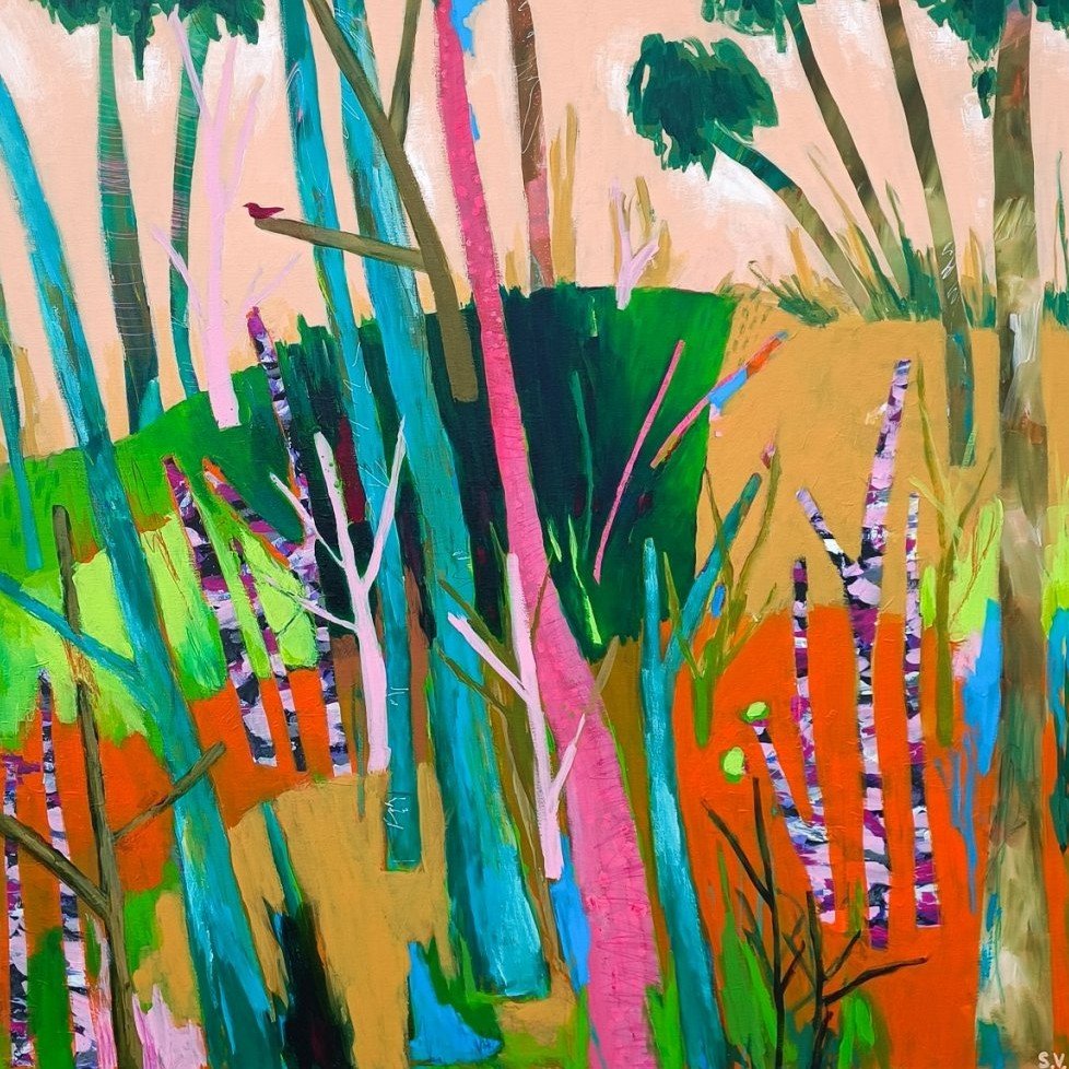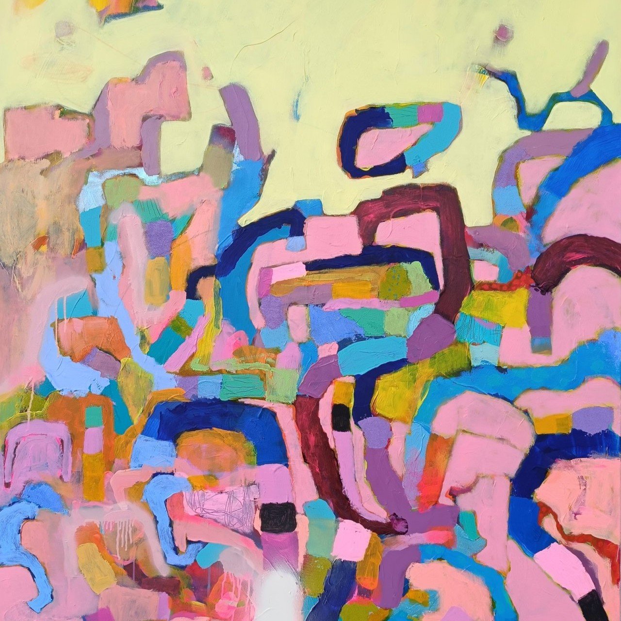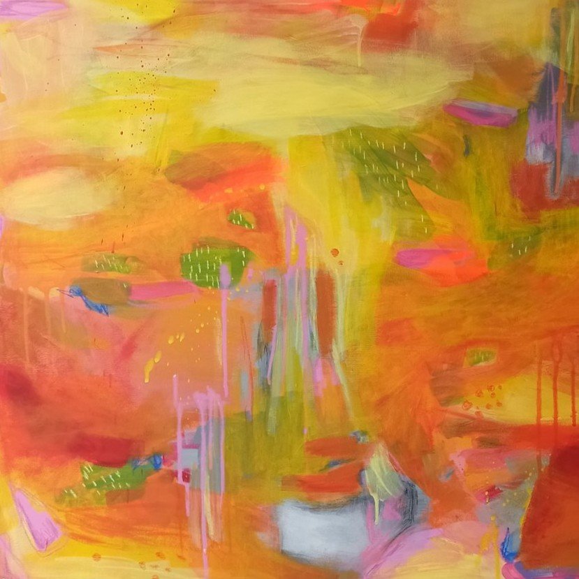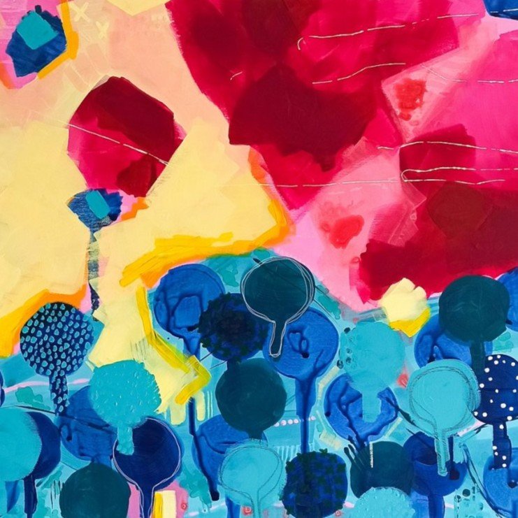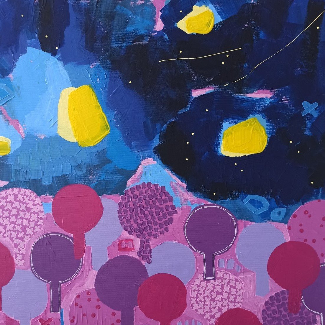 Postupně jsem se od konkrétnějších stromových motivů přesunula k volnější abstrakci. Začala jsem experimentovat s plochou, barvou a energií obrazu bez konkrétního tvarového ukotvení. Vznikaly obrazy laděné do jedné dominantní barevnosti – například teplé žluté, růžové nebo tyrkysové, kde barva sama vytvářela atmosféru.