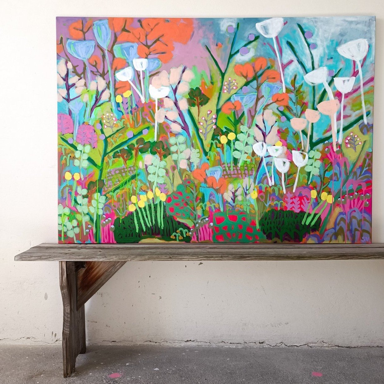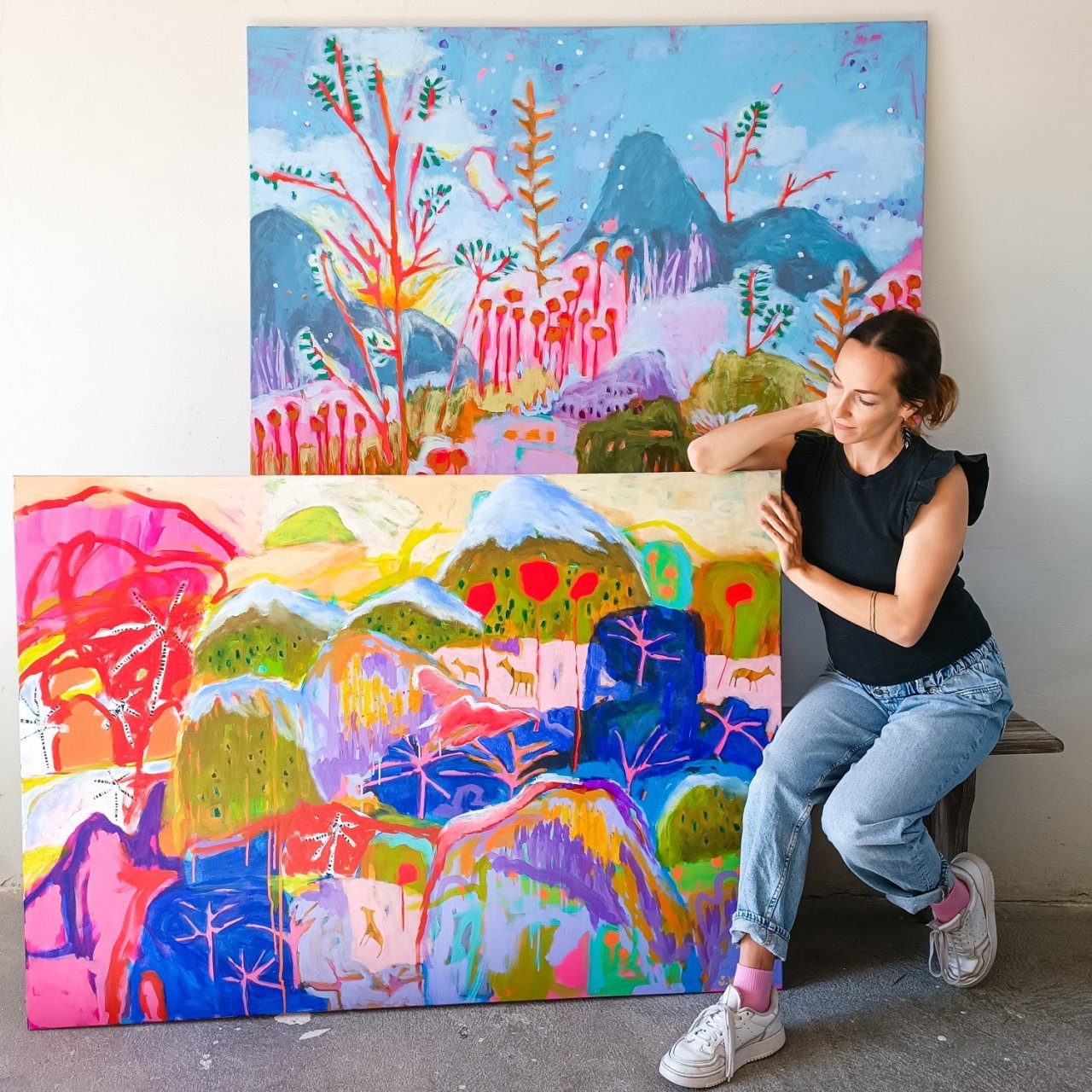 Rok 2023 tak pro mě znamenal období přechodu – od hledání stylu k jeho postupnému upevnění, od menších obrazů k velkým formátům a zároveň k objevování nových technik, jako jsou vlněné tapisérie.