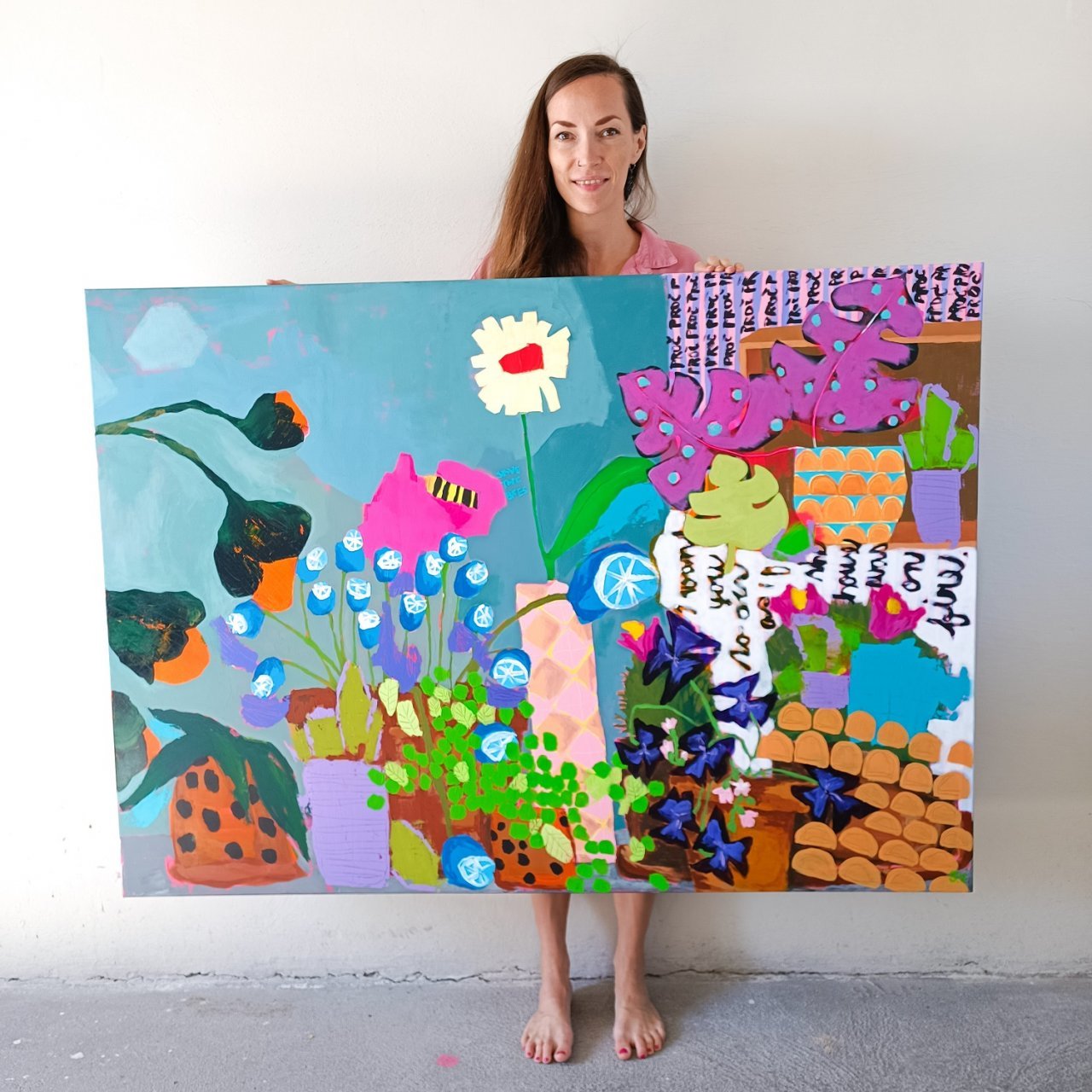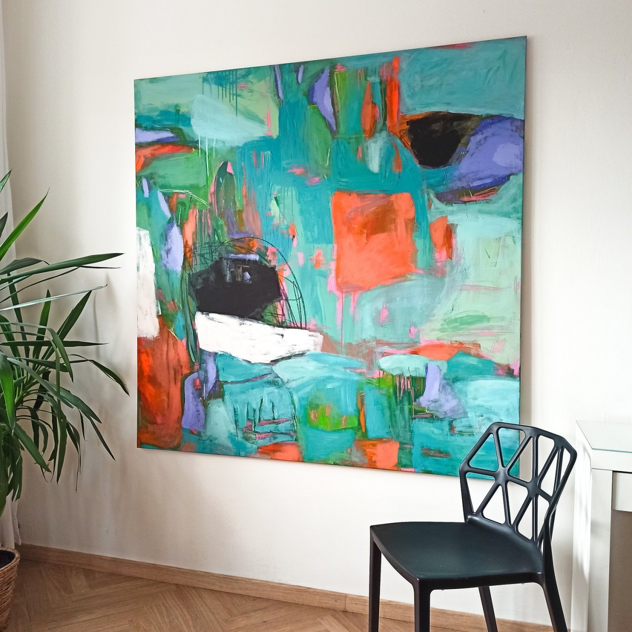 V mé tvorbě se dlouhodobě objevují abstraktní květinové motivy, práce s vrstvami a výrazné, ale harmonické barevné kombinace. Velký formát mi umožňuje pracovat s energií prostoru – obraz pak není jen dekorací, ale stává se jeho přirozenou součástí.