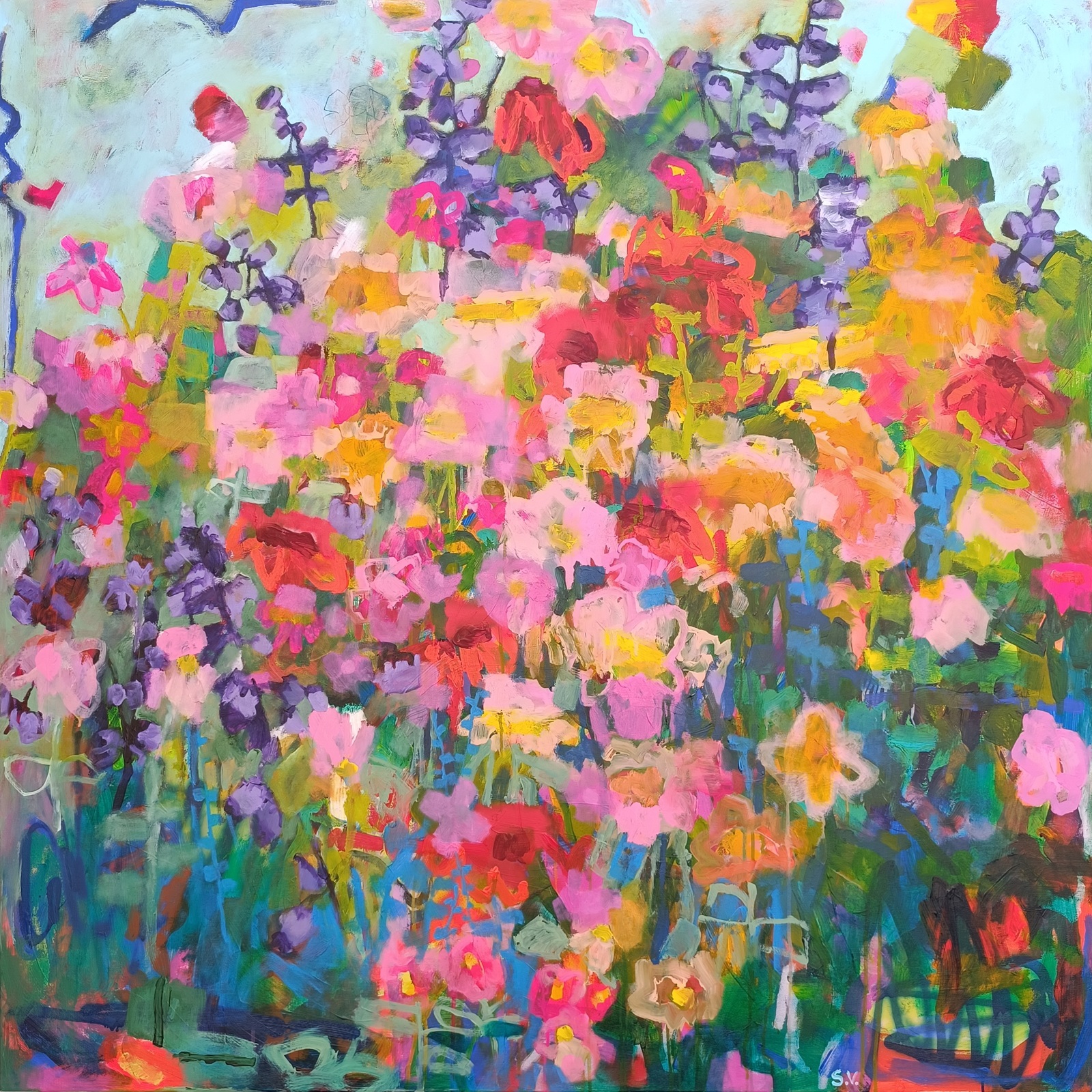 Hustě rozkvetlá zahrada plná zeleně, růžových a fialových květů. Originál má 140 × 140 cm.