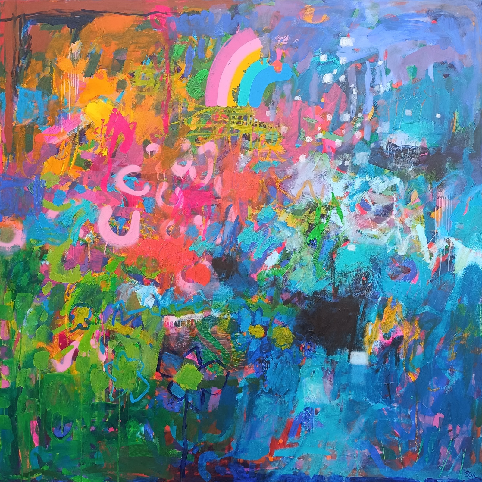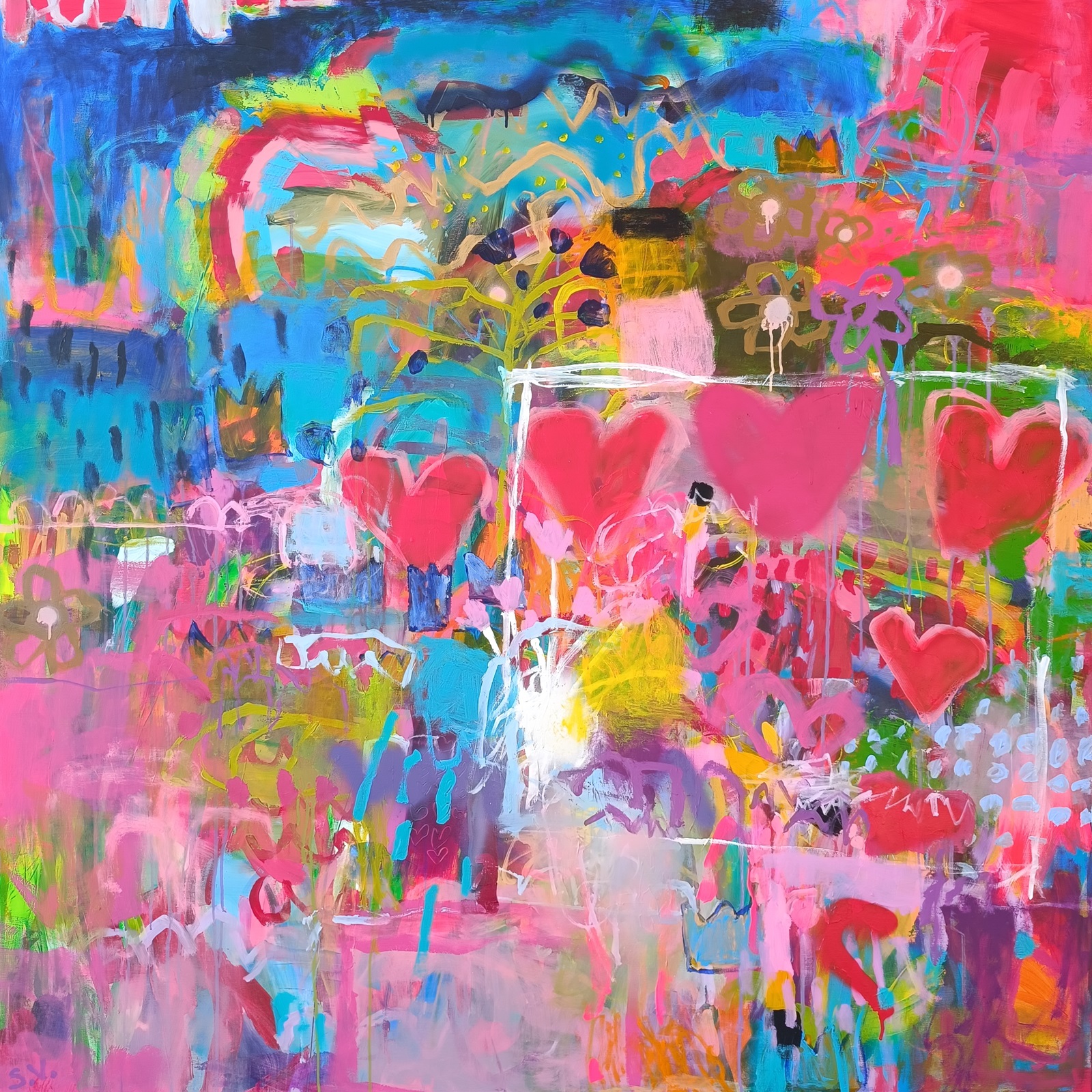 Abstraktní motiv se srdíčky, duhou a náznaky květin. Originál má 150 x 150 cm.
