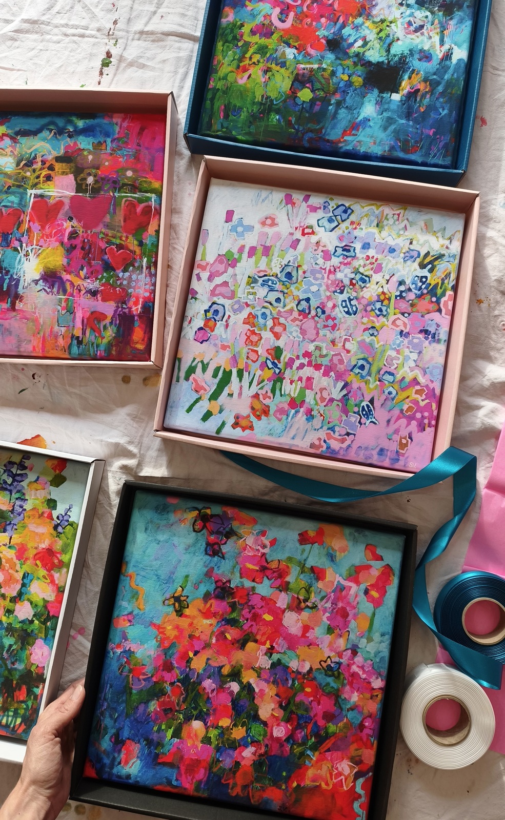 Vybrala jsem pět svých obrazů a převedla je do menšího formátu 30 × 30 cm, který se hodí téměř do každého interiéru – na polici, do galerie na stěně nebo jako samostatný solitér.