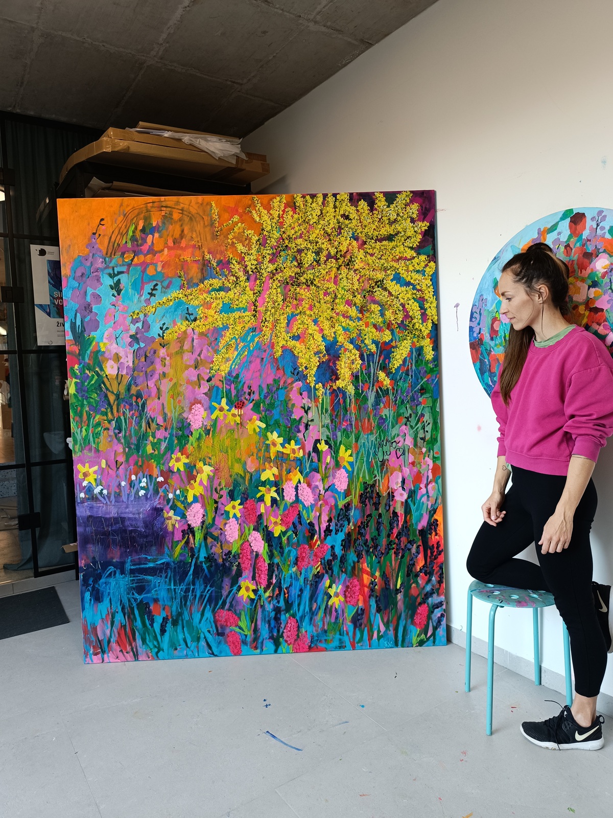 Spring Awakening je velkoformátový abstraktní obraz o rozměru 160 × 200 cm, malovaný akrylem na plátně. Kompozice zachycuje moment přechodu do jara – objevují se zde žluté narcisy, růžové a fialové květy, hyacinty i sněženky, doplněné o motiv zlatého deště a jemnou duhu na obloze. V obraze je skrytý i drobný nápis „Jaro je láska (srdíčko)“, který odkazuje na to, že jaro je mé nejoblíbenější období.