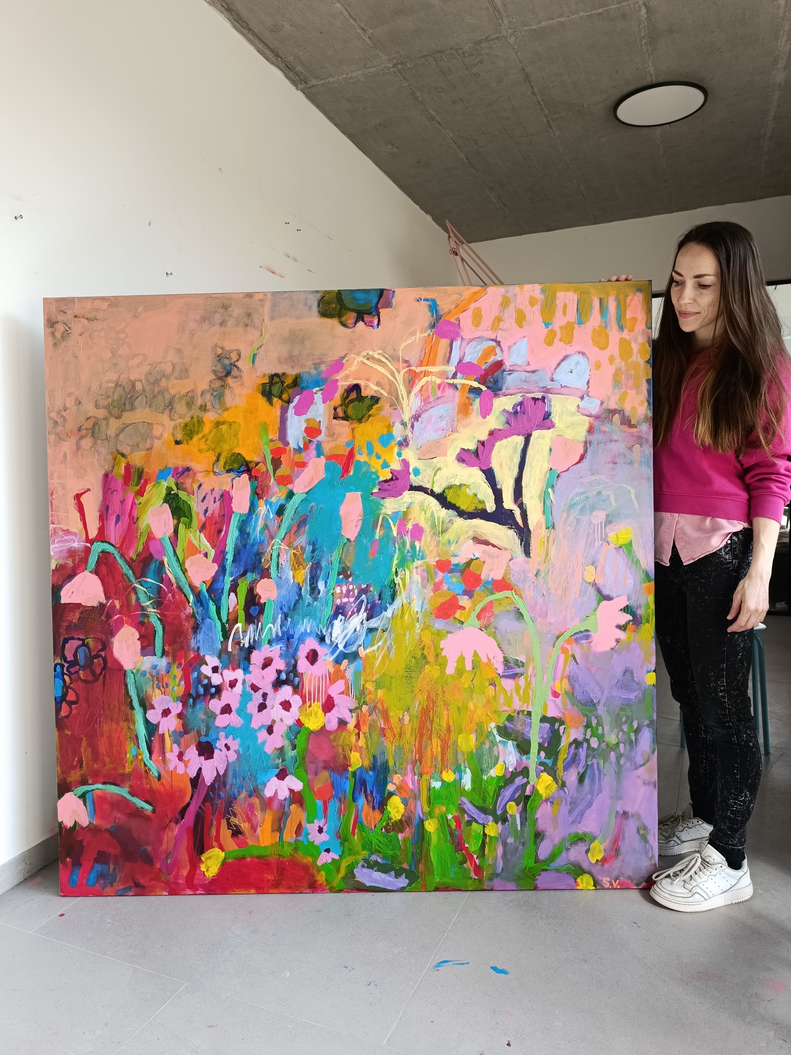 Spring Poem je abstraktní obraz o rozměru 150 × 150 cm, malovaný akrylem na plátně. Kompozice pracuje s tvary květin, které jsou zpracované volně a hravě, doplněné o výrazné linie a barevné plochy. Růžové květy, proměnlivé nebe a kontrastní barevnost vytvářejí dynamický, ale harmonický celek, který působí radostně a uvolněně.